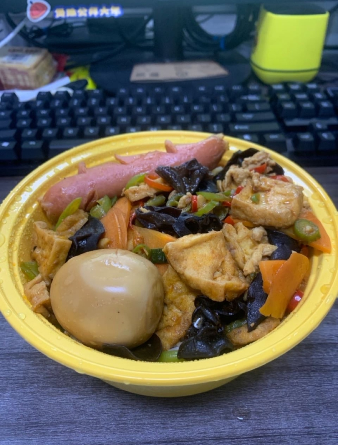 Mixed Stir-Fry | ["sausage","tofu","black fungus","carrots","egg","green onions"] | ["sausage:100g","tofu:150g","vegetables:200g","egg:50g"] | |