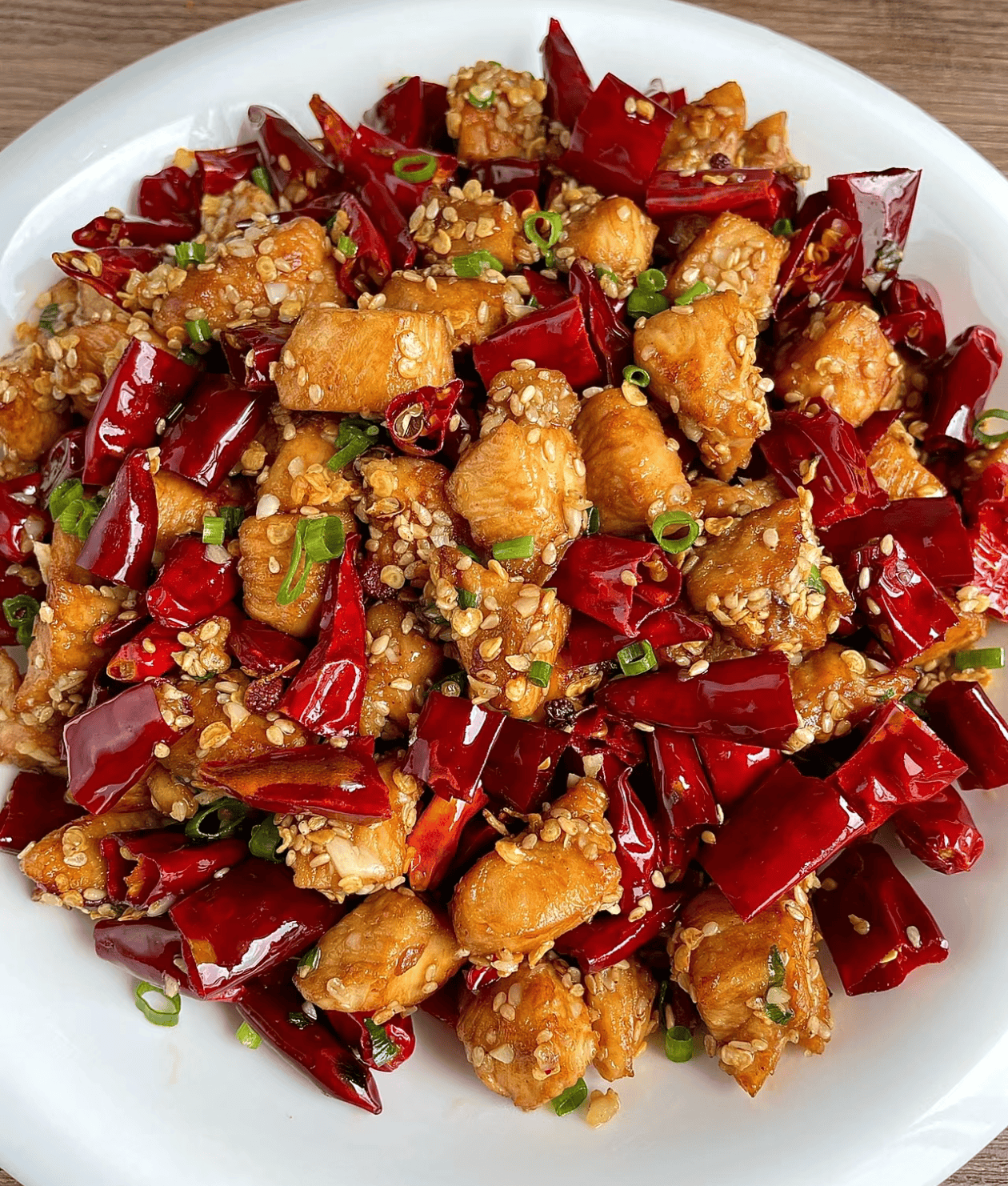 Spicy Chicken Stir-Fry | ["chicken","dried chili","sesame seeds","green onion"] | ["chicken:250g","dried chili:50g","sesame seeds:20g","green onion:30g"] | |