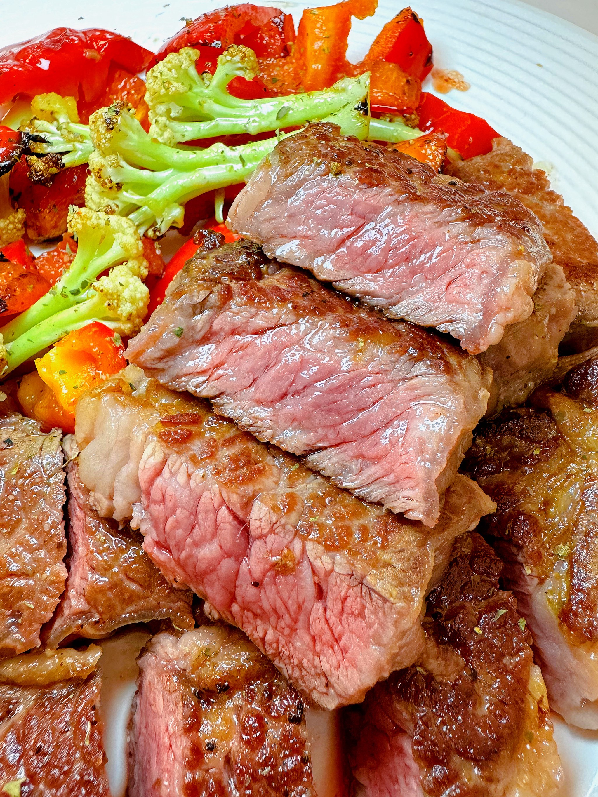 Grilled Steak with Vegetables | ["steak","broccoli","bell peppers","cauliflower"] | ["steak:250g","mixed vegetables:150g"] | |