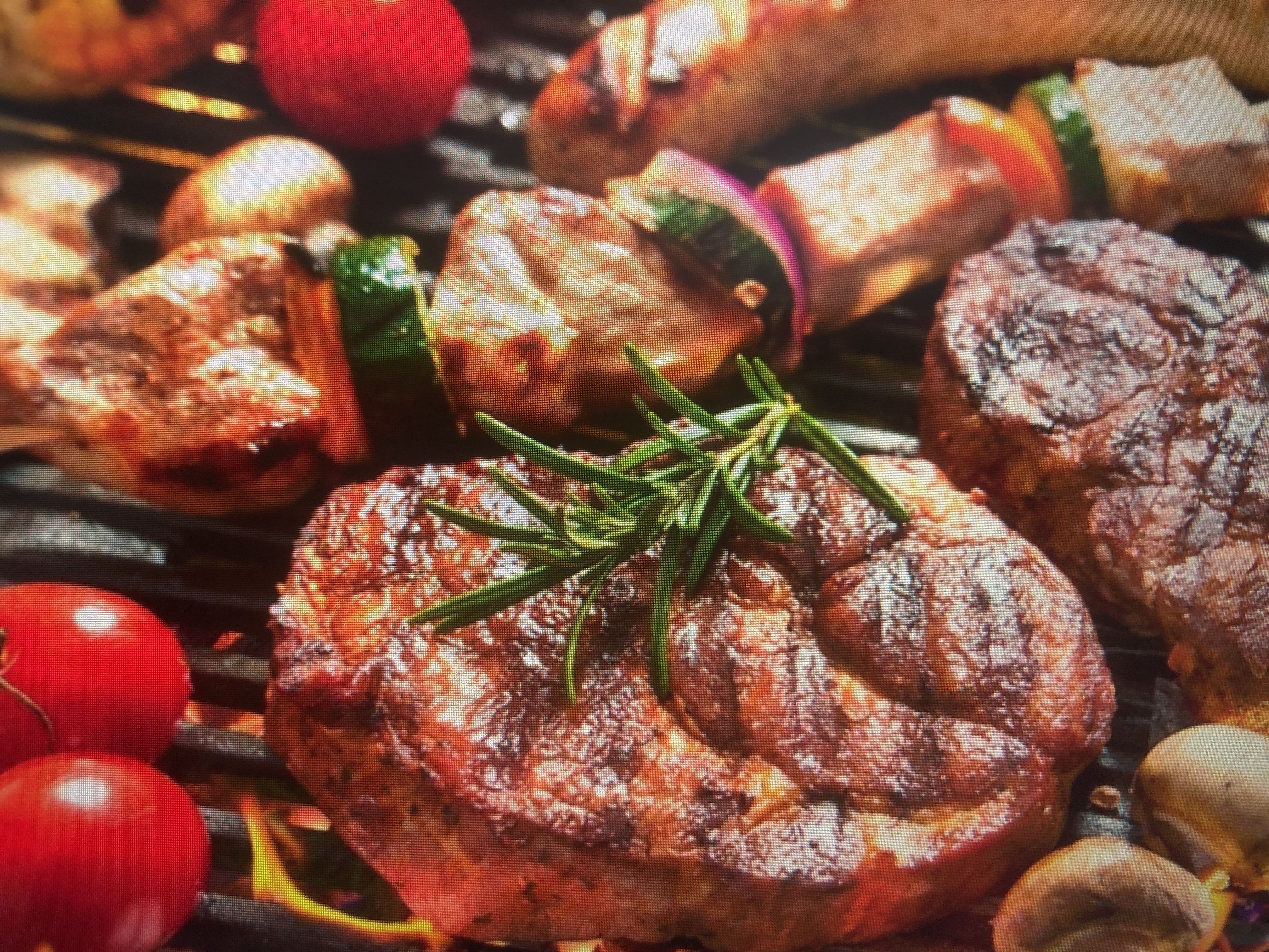 Grilled Meat Platter | ["beef","chicken","zucchini","bell peppers","cherry tomatoes","mushrooms"] | ["beef:200g","chicken:150g","vegetables:100g"] | |