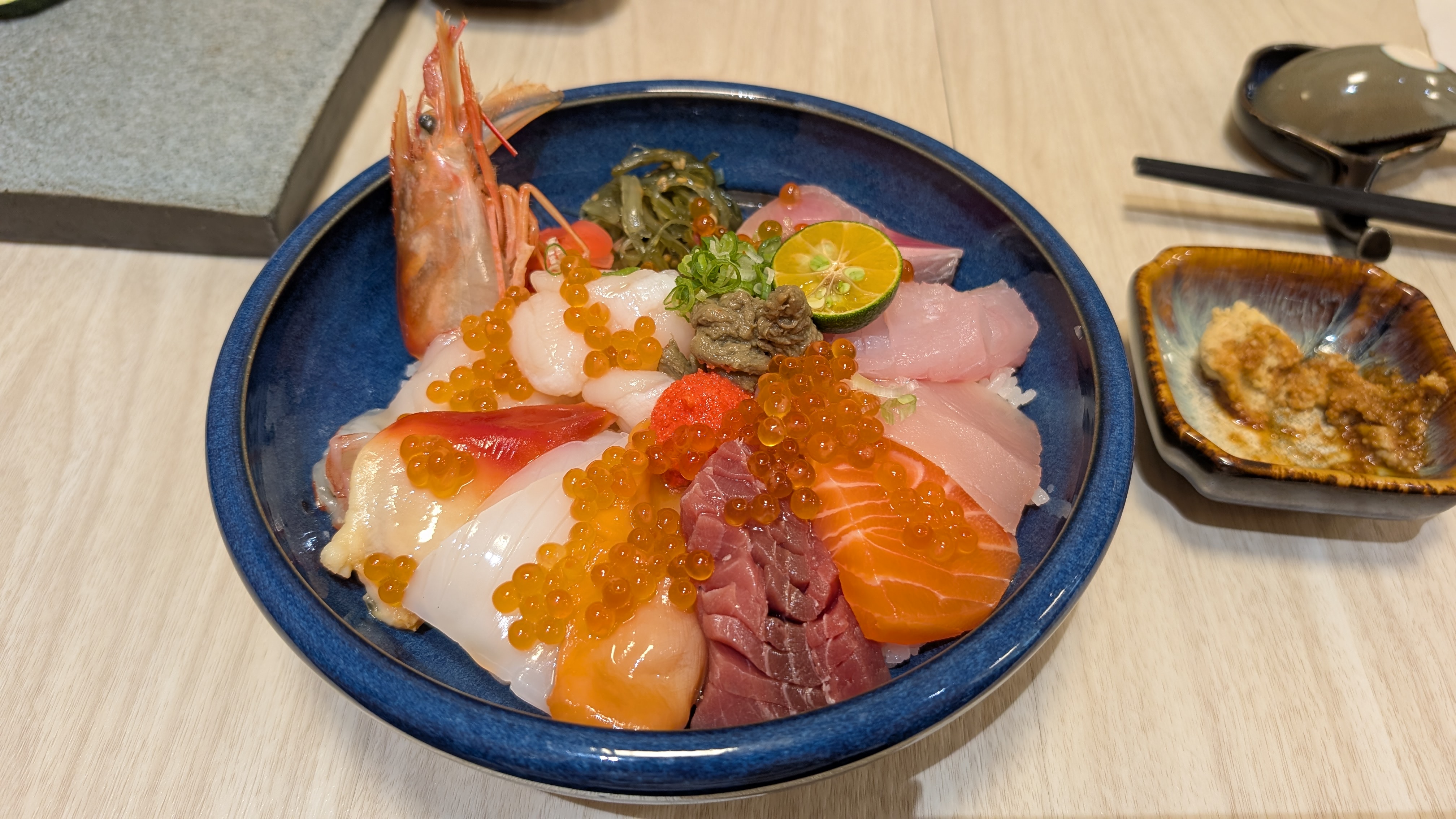 Sashimi Bowl | ["salmon","tuna","shrimp","rice","seaweed","fish roe"] | ["fish:200g","rice:150g","toppings:50g"] | |