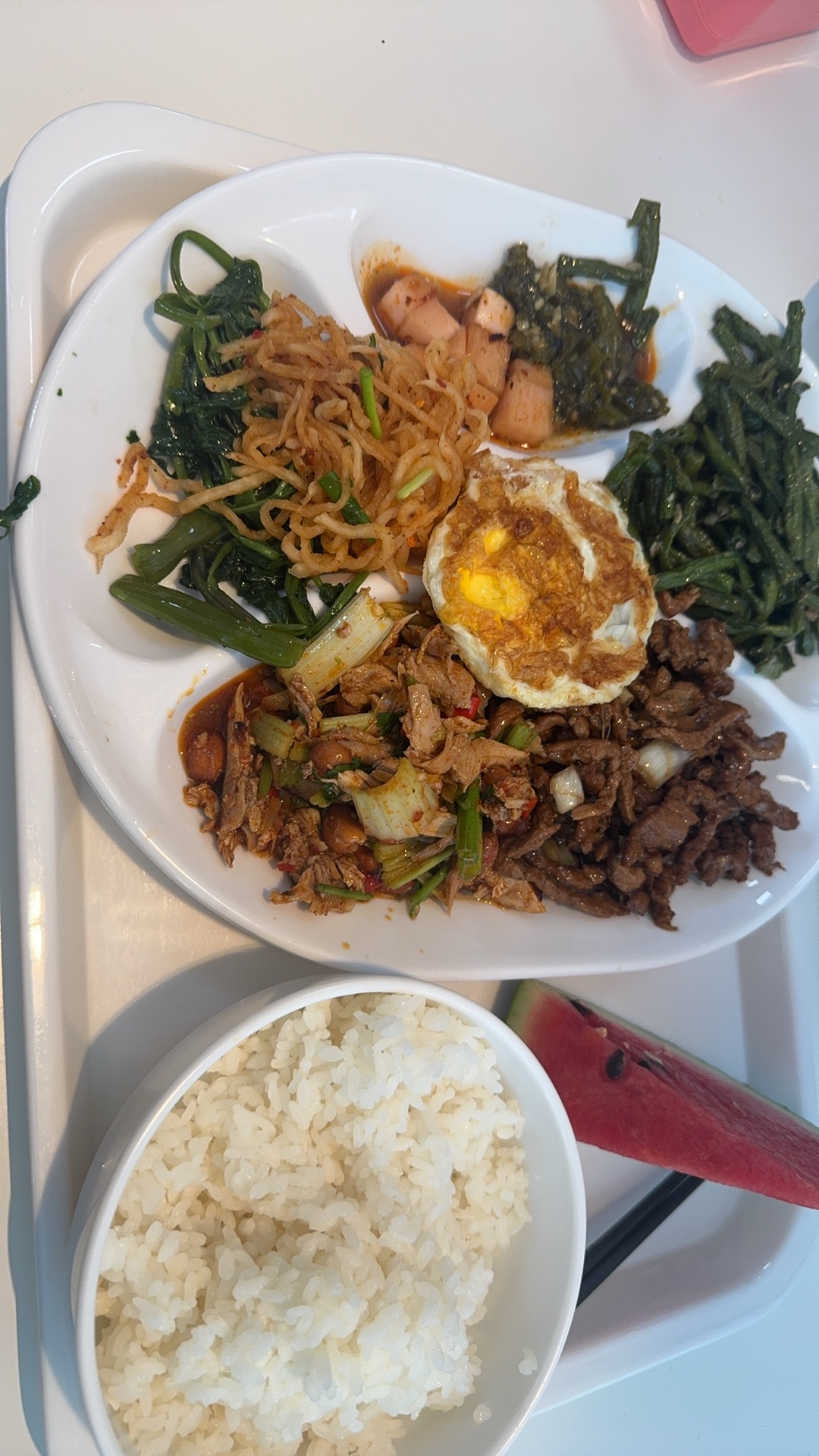 Mixed Buffet Dishes | ["rice","mixed vegetables","meat"] | ["rice:200g","vegetables:150g","meat:100g"] | |