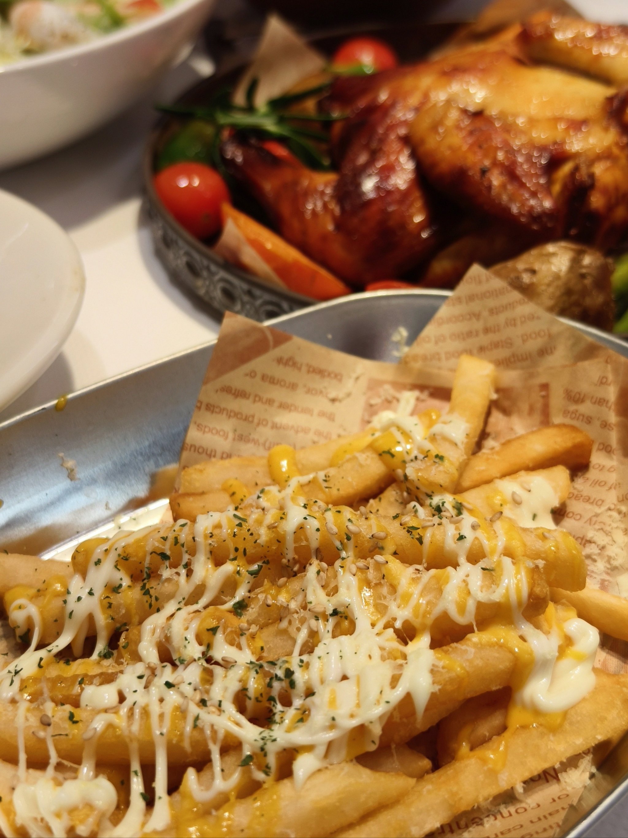Loaded Fries with Roasted Chicken | ["fries","cheese","mayonnaise","roasted chicken","seasoning"] | ["fries:300g","roasted chicken:200g"] | |