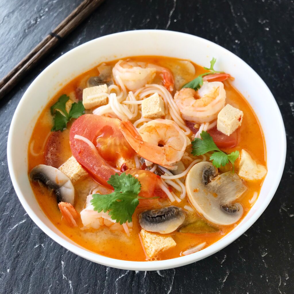 Shrimp Noodle Soup | ["shrimp","noodles","tomato","mushrooms","tofu","cilantro"] | ["shrimp:150g","noodles:100g","vegetables:100g"] | |