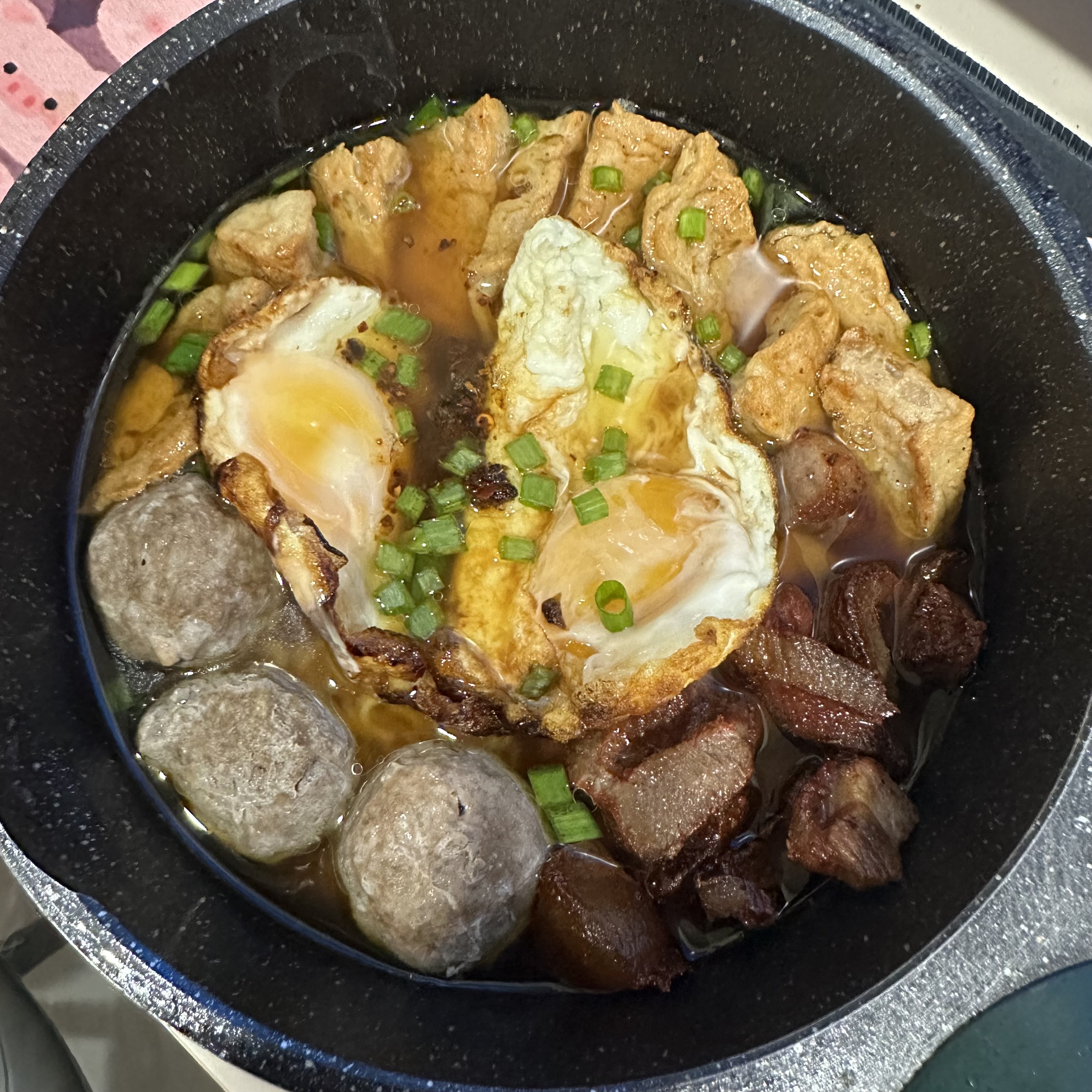 Egg and Meatball Soup | ["eggs","meatballs","broth","green onions"] | ["eggs:200g","meatballs:150g","broth:250g"] | |