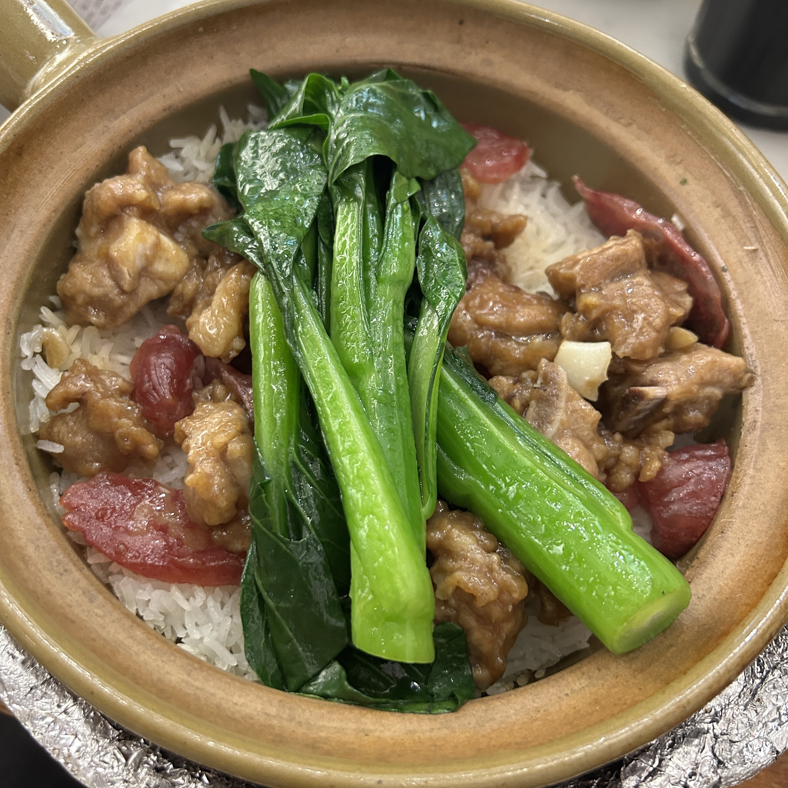 Claypot Rice | ["rice","chicken","Chinese sausage","bok choy"] | ["rice:250g","chicken:100g","vegetables:100g"] | |