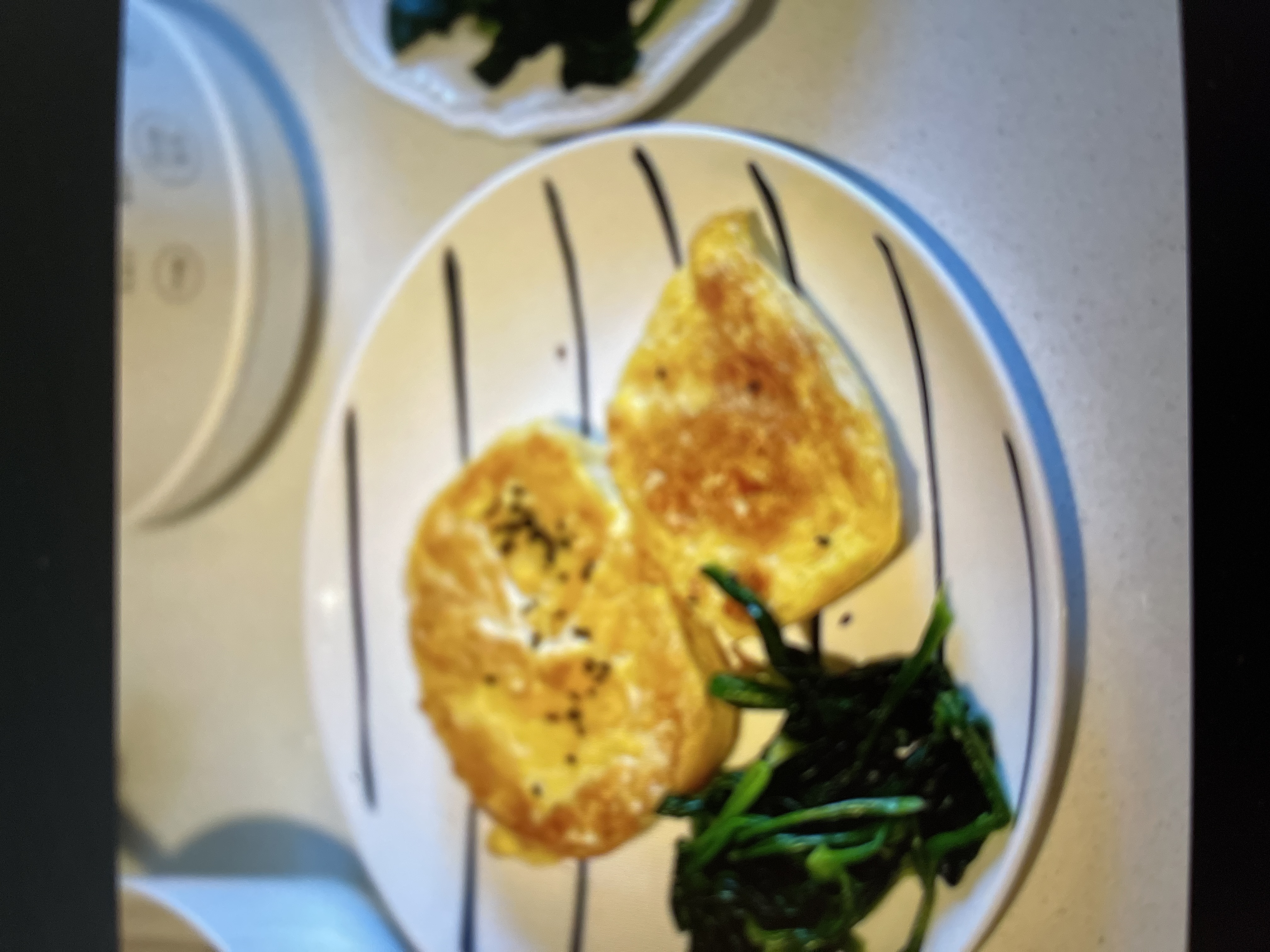 Eggs with sautéed greens | ["eggs","spinach","oil"] | ["eggs:200g","greens:100g"] |