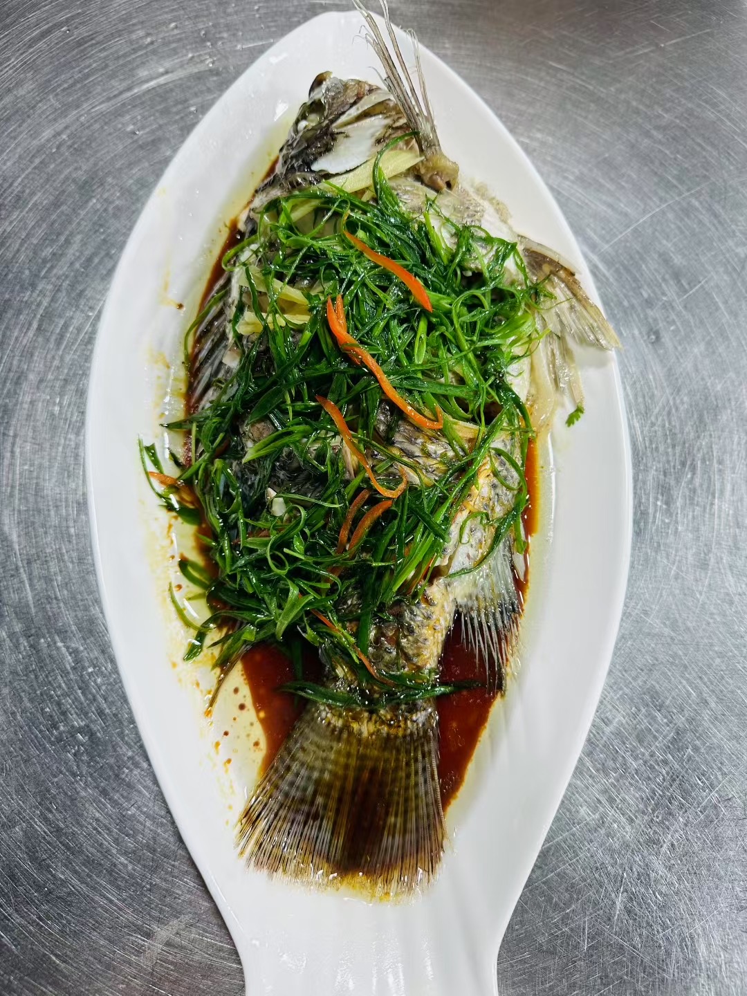 Steamed Fish with Vegetables | ["fish","green onions","carrots","soy sauce"] | ["fish:300g","vegetables:50g"] | |