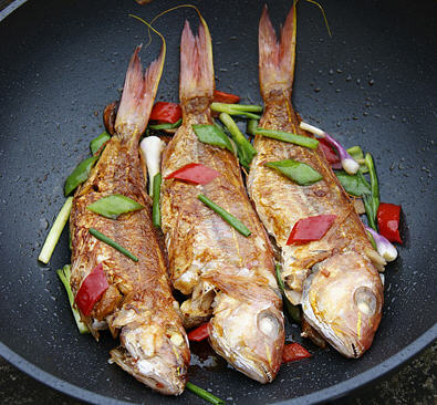 Fried Fish with Vegetables | ["fish","bell peppers","green onions","garlic"] | ["fish:300g","vegetables:100g"] | |