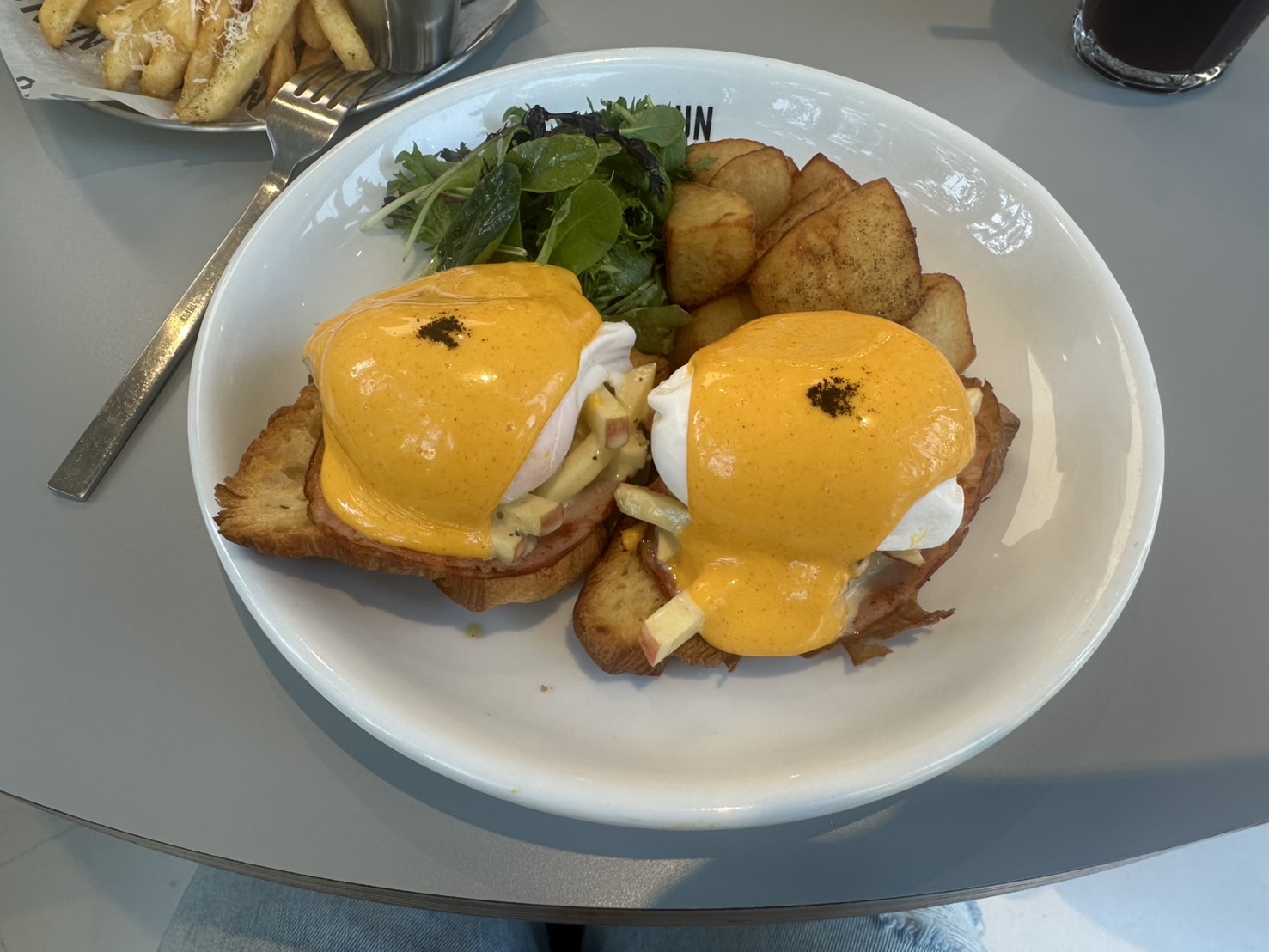 Eggs Benedict | ["bread","eggs","ham","hollandaise sauce","potatoes","mixed greens"] | ["bread:100g","eggs:150g","ham:50g","sauce:50g","potatoes:200g","greens:50g"] | |