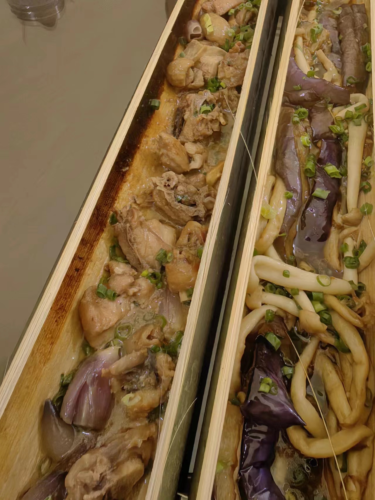 Meat and Vegetable Stew | ["chicken","eggplant","green onions","ginger"] | ["meat:300g","vegetables:200g"] | |