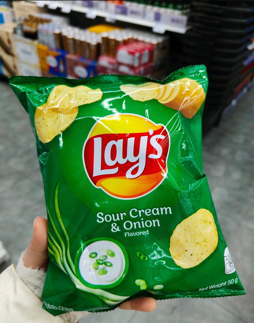 Sour Cream & Onion Potato Chips | ["potatoes","oil","sour cream powder","onion powder","seasoning"] | ["potato chips:50g"] | |