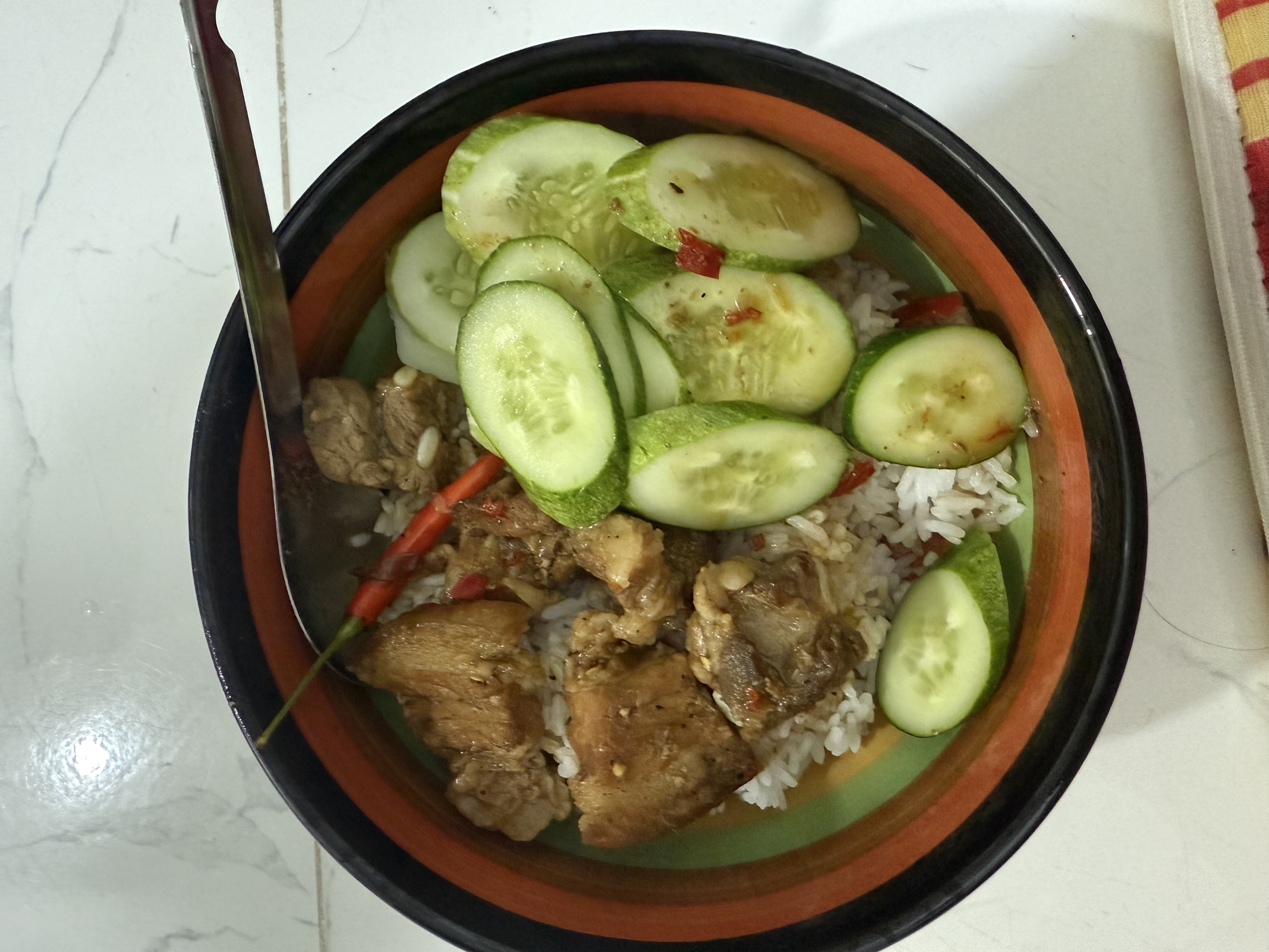 Chicken Rice | ["chicken","rice","cucumber","chili"] | ["chicken:200g","rice:300g","cucumber:100g"] | |