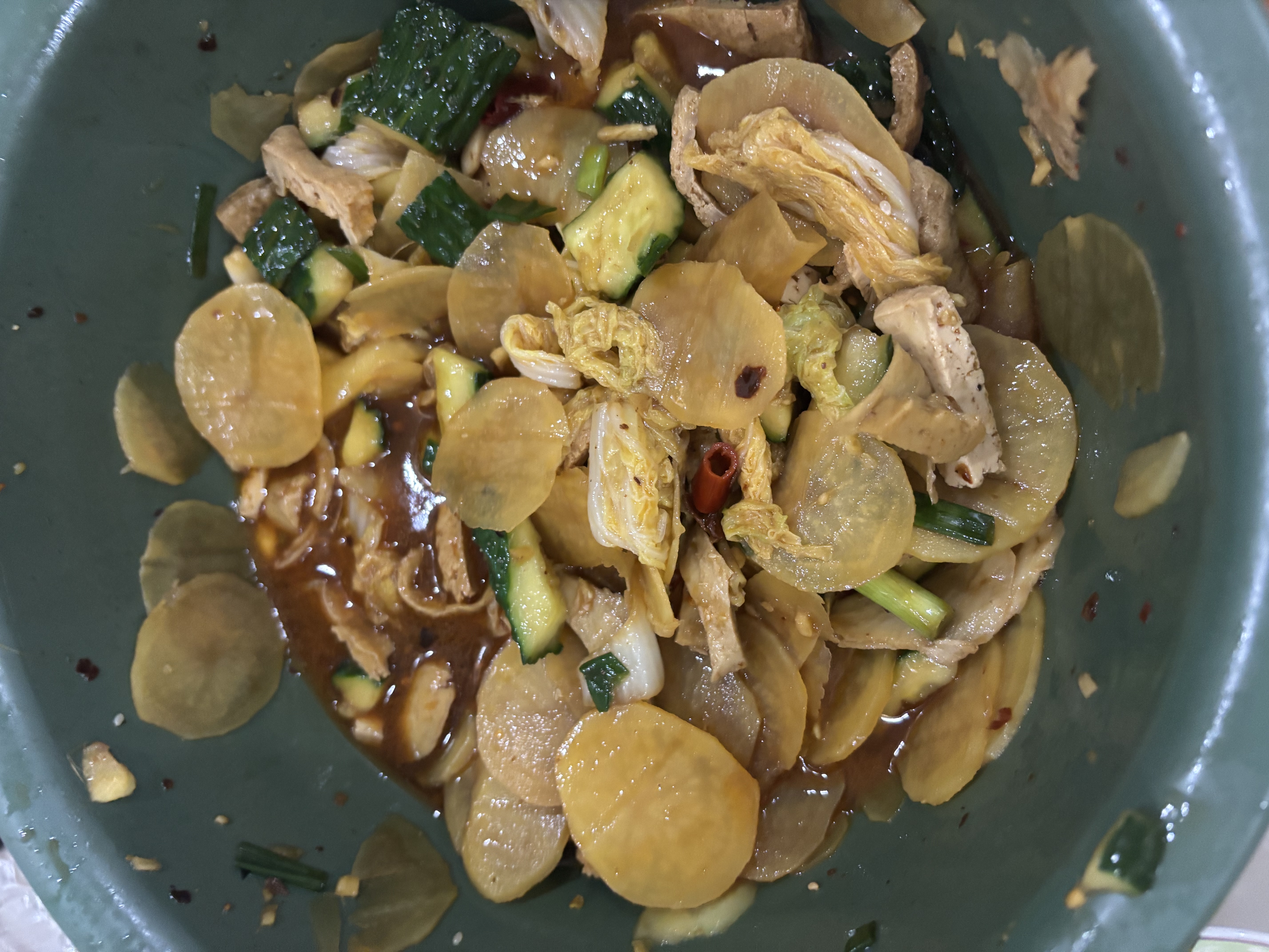 Dumplings and Salad | ["dumplings","cucumber","seaweed","tofu","chili","soy sauce"] | ["dumplings:300g","salad:150g","tofu:100g"] | |