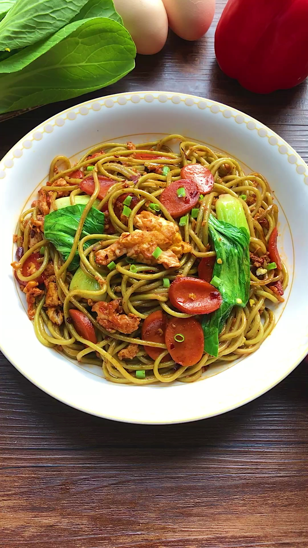 Stir-fried Noodles | ["noodles","chicken","carrots","bok choy","green onions"] | ["noodles:200g","chicken:100g","vegetables:150g"] | |