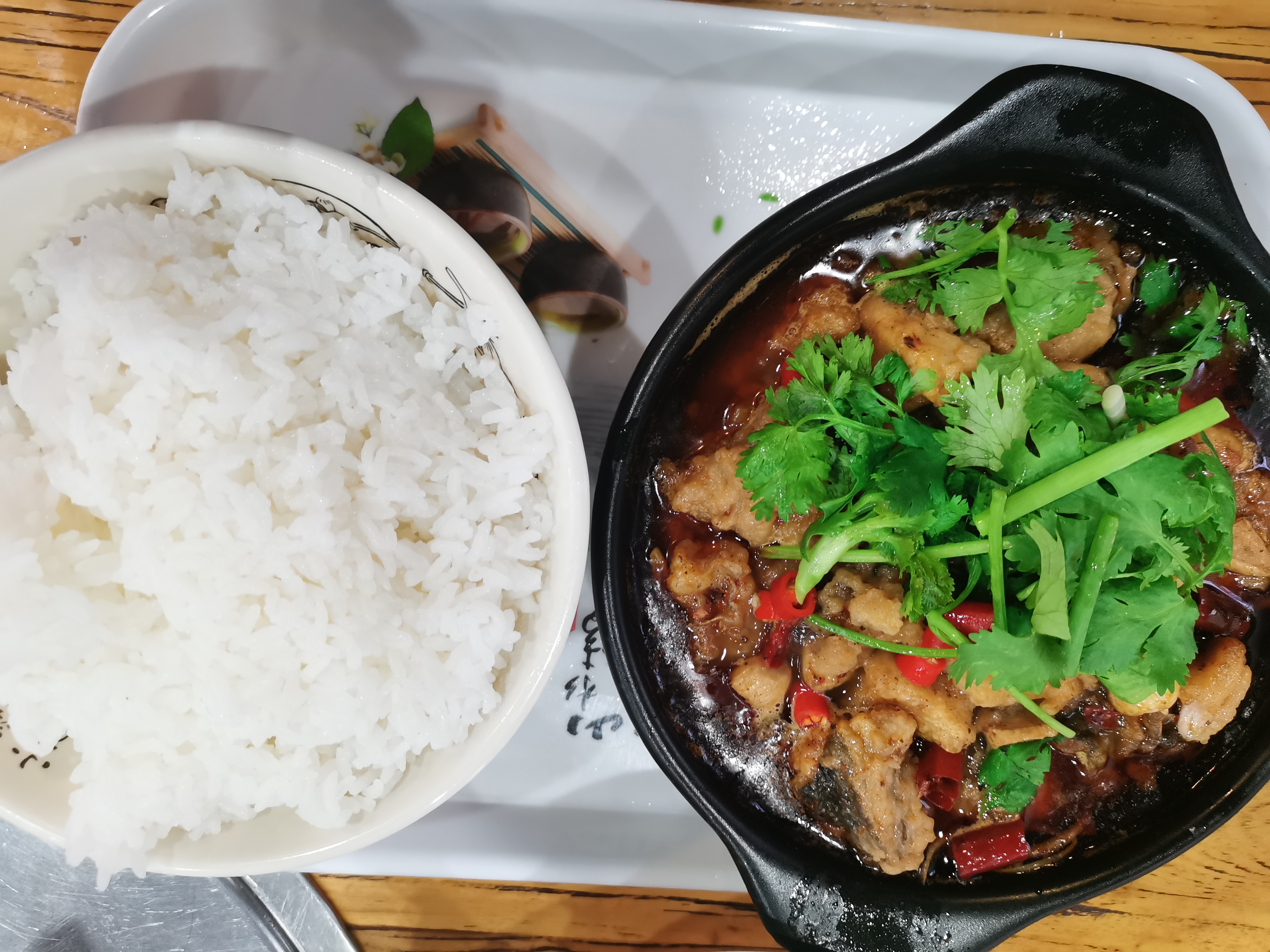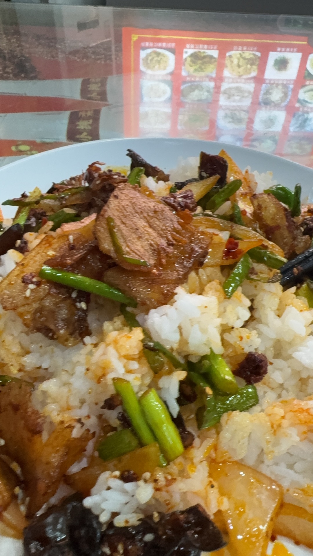 Stir-fried meat with rice | ["rice","meat","cilantro","chili peppers","sauce"] | ["rice:200g","meat:150g"] | |
