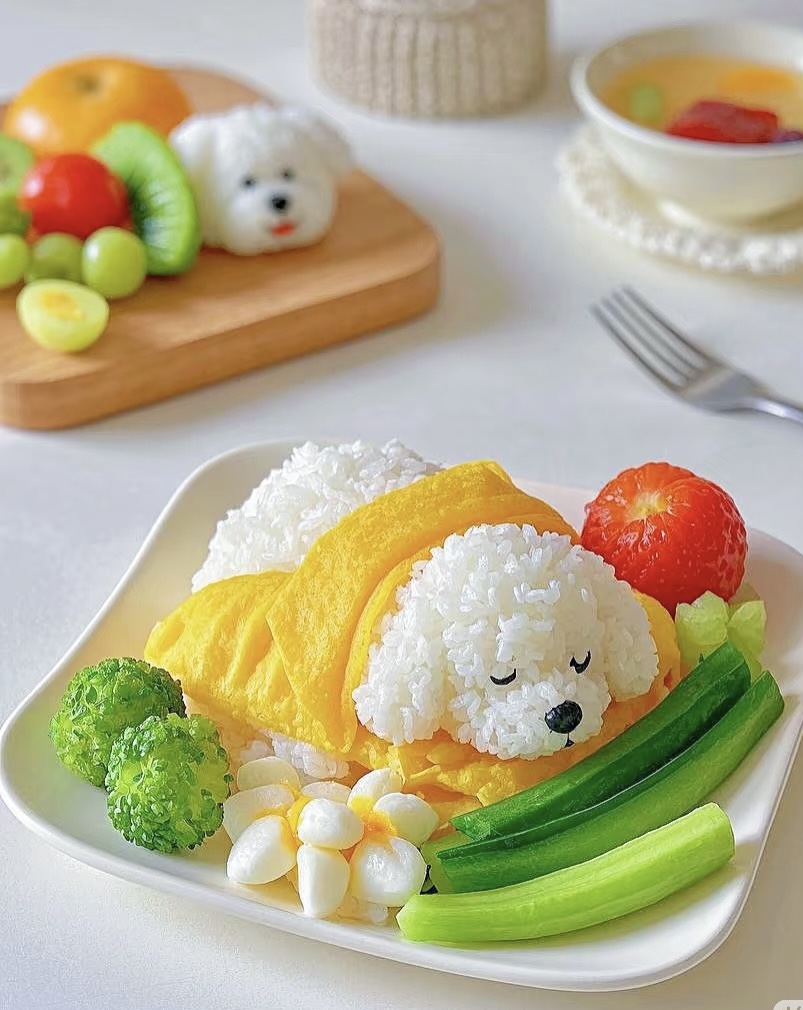 Decorative Rice Dish | ["rice","egg","broccoli","cucumber","strawberry"] | ["rice:200g","egg:50g","broccoli:100g","cucumber:100g","strawberry:50g"] | |