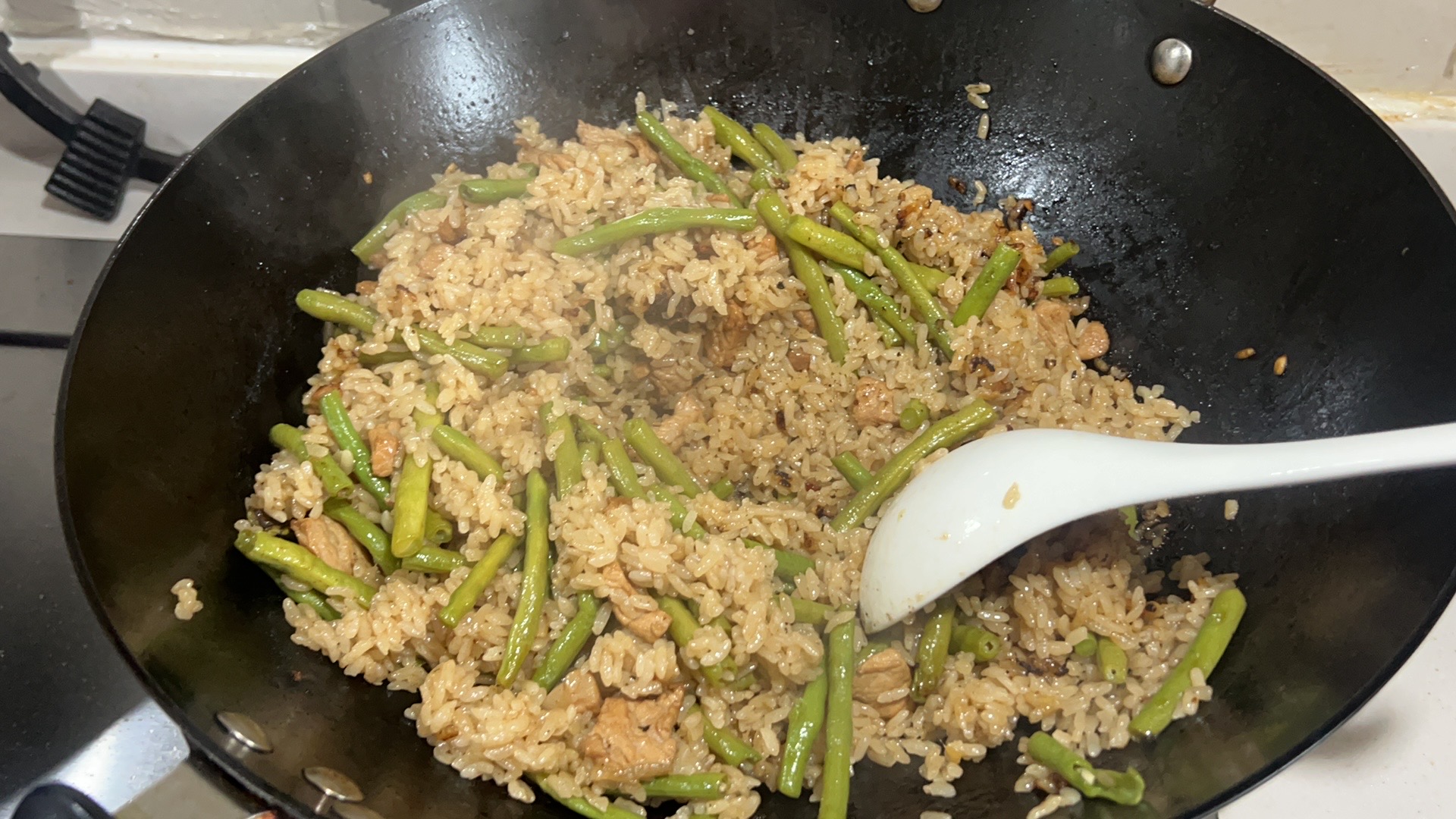 Stir-fried Rice with Chicken and Green Beans | ["rice","chicken","green beans","soy sauce","oil"] | ["rice:300g","chicken:100g","green beans:50g"] | |