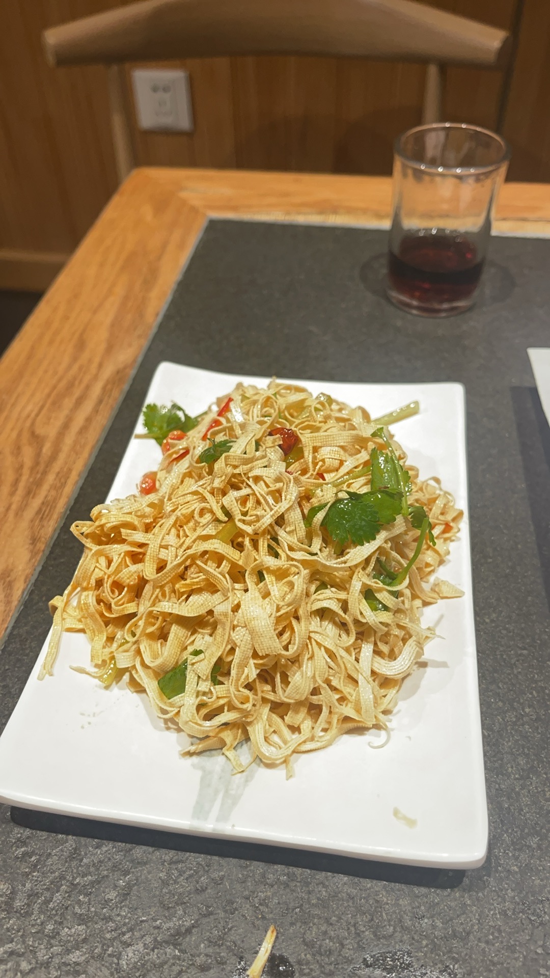 Noodle Salad | ["noodles","cilantro","peppers","dressing"] | ["noodles:250g","vegetables:100g"] | |