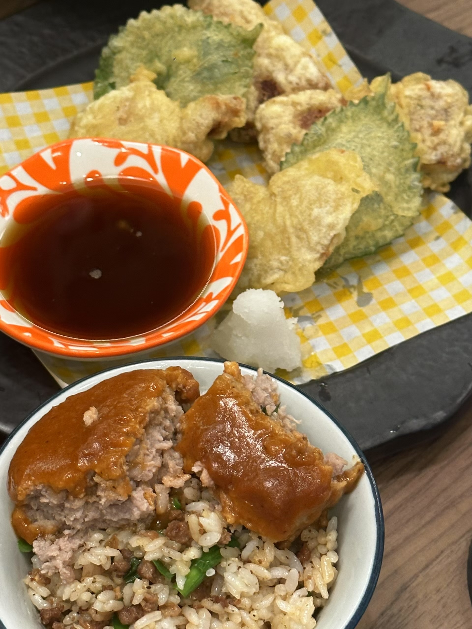 Fried Rice with Meat and Tempura | ["rice","ground meat","tempura vegetables","sauce"] | ["rice:300g","meat:100g","tempura:150g"] | |
