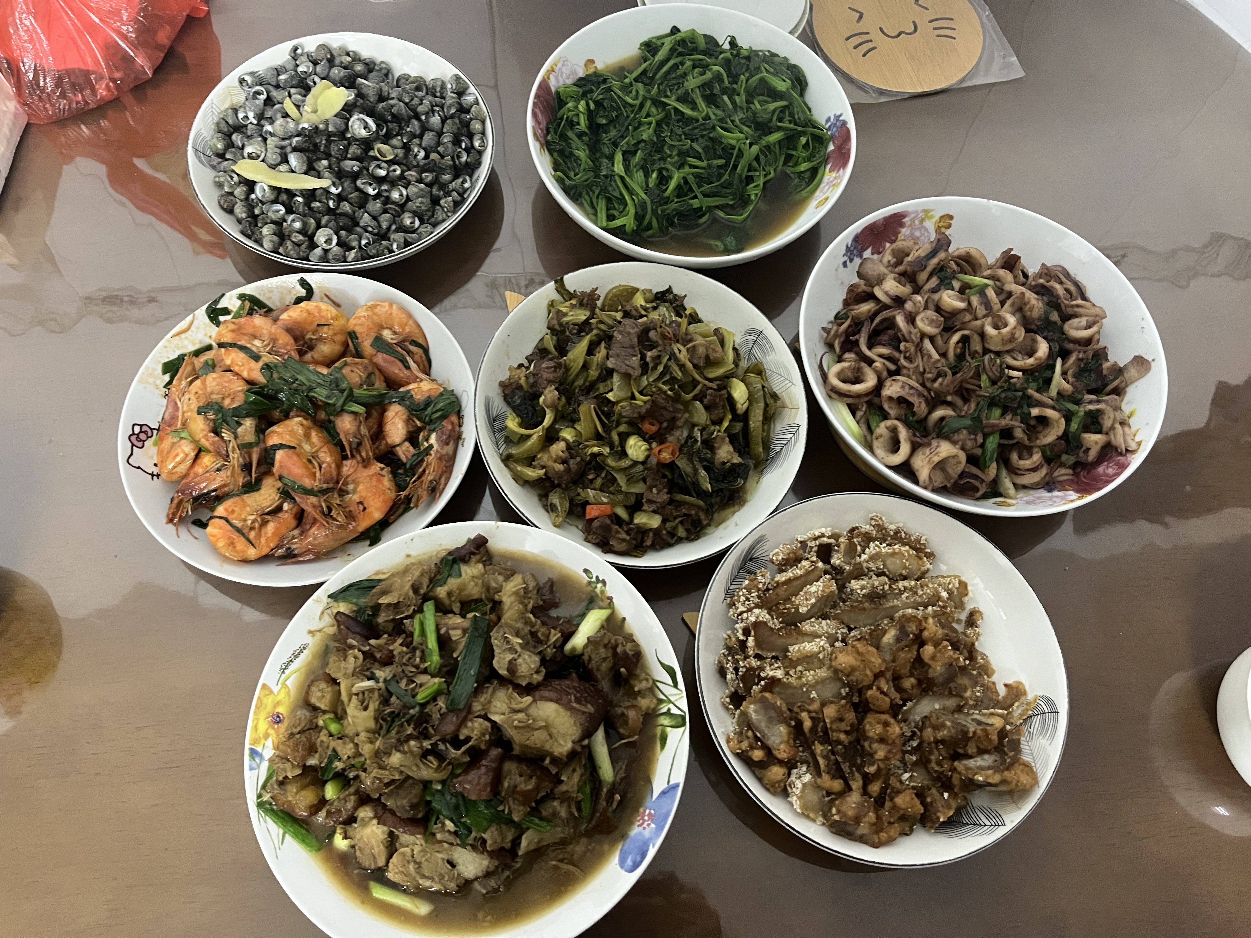 Mixed Seafood and Meat Dishes | ["shrimp","beef","pork","squid","various vegetables"] | ["shrimp:200g","beef:150g","pork:150g","vegetables:200g","squid:100g"] | |