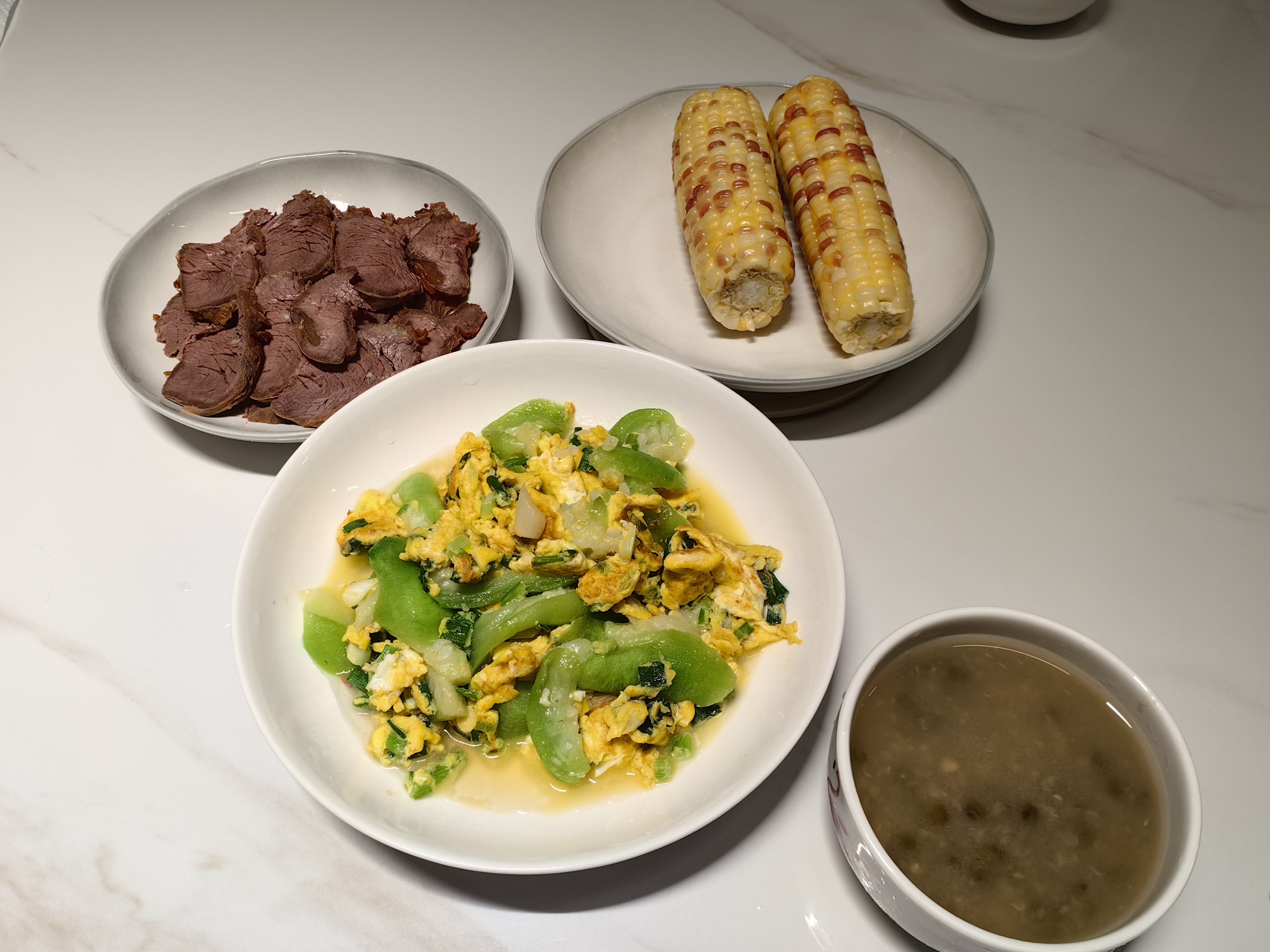 Stir-fried vegetables with eggs, corn, and beef | ["green bell pepper","eggs","beef","corn","soup"] | ["vegetables:200g","beef:150g","corn:150g","soup:100g"] | |