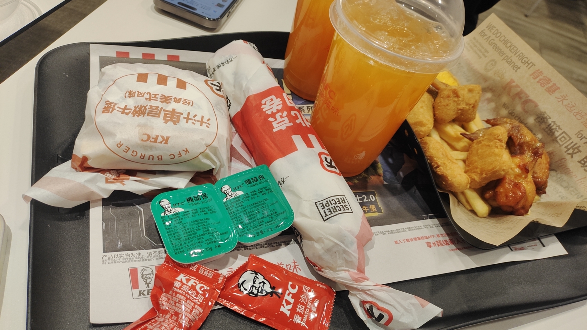 Fast Food Meal | ["burger","fried chicken","fries","soft drink"] | ["burger:250g","chicken:150g","fries:100g","drink:300ml"] | |