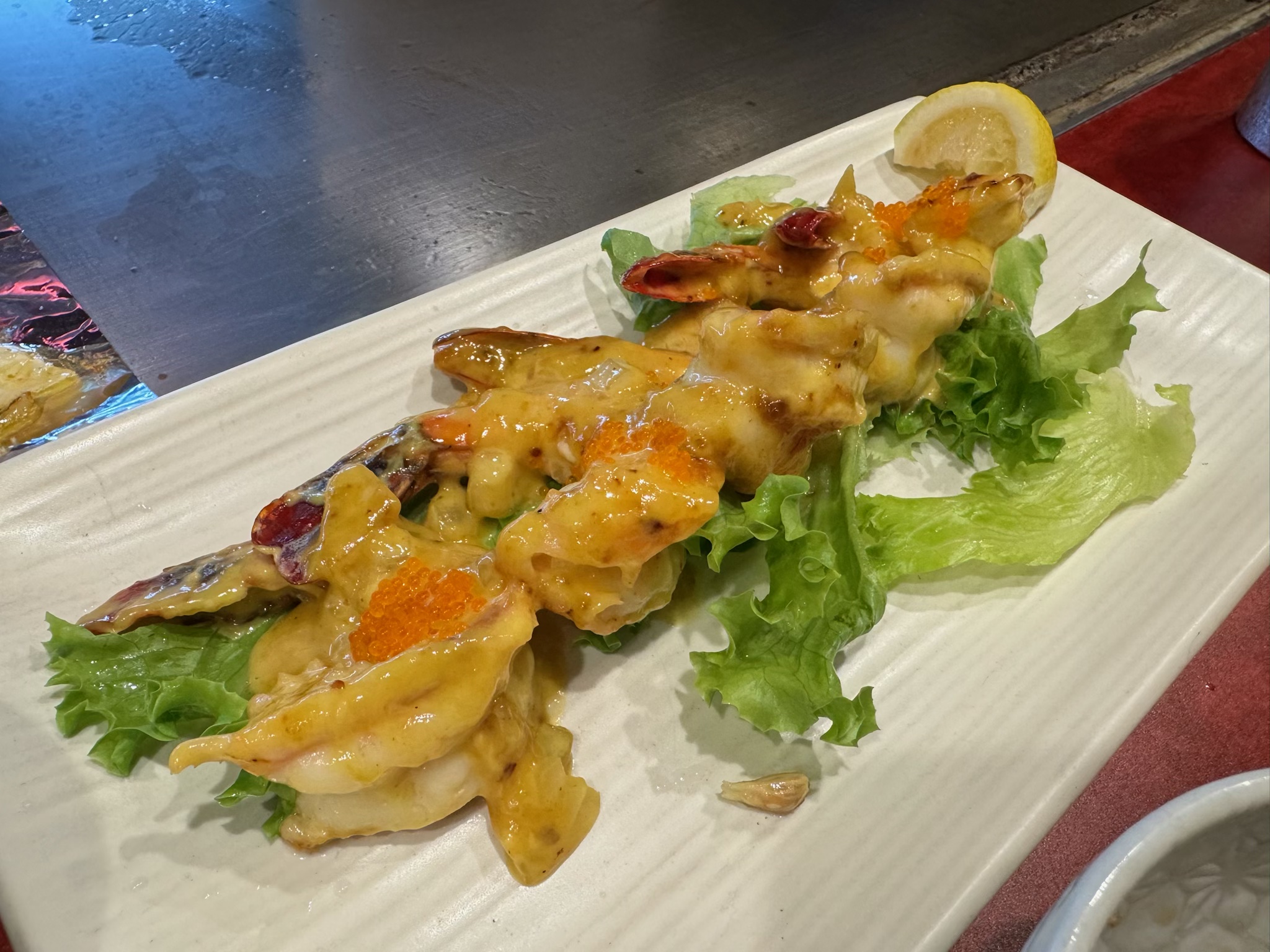 Shrimp with Sauce | ["shrimp","sauce","lettuce","lemon"] | ["shrimp:200g","sauce:50g","lettuce:50g"] | |