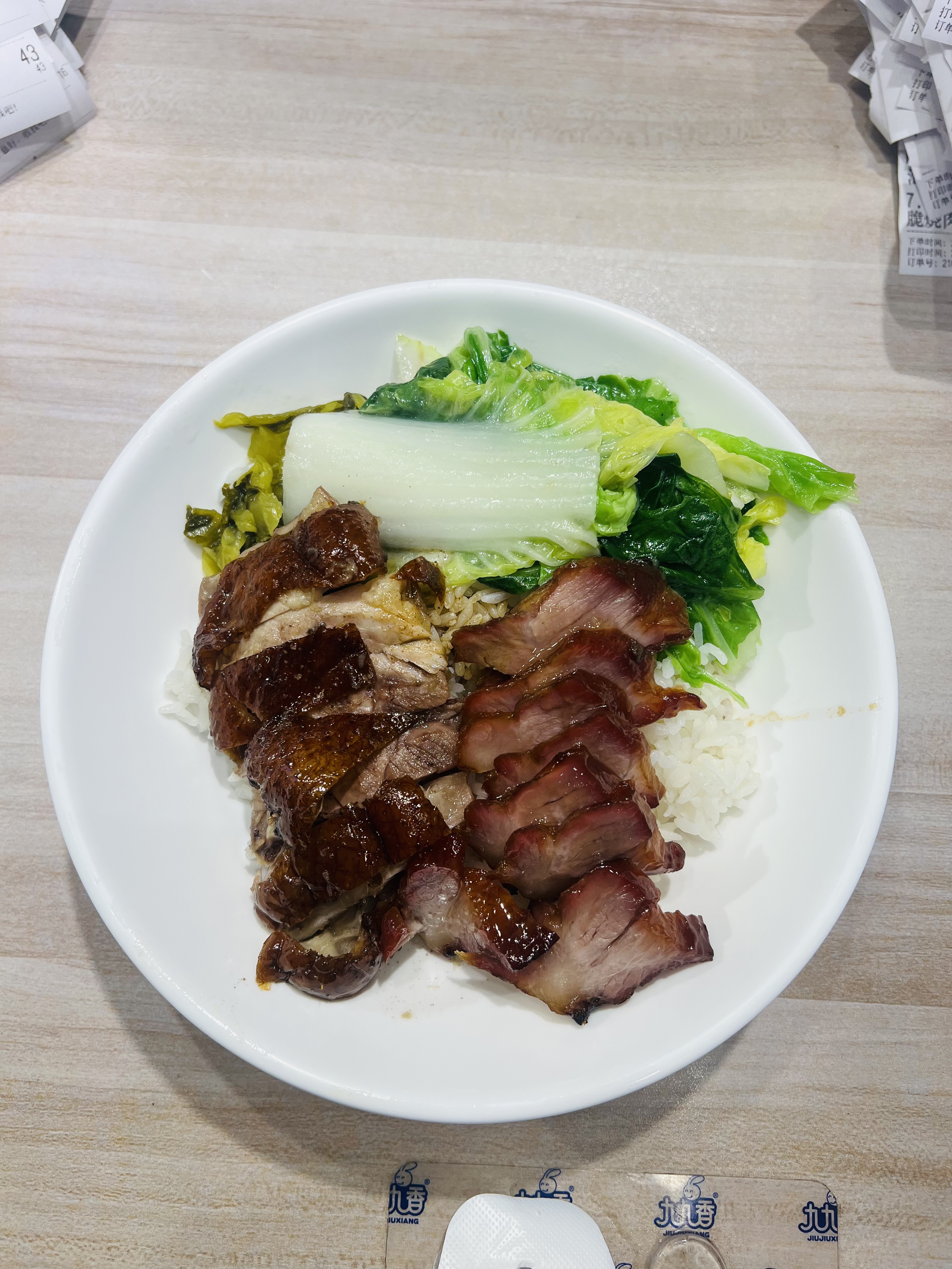 Roast Meat Rice | ["roast pork","roast duck","rice","bok choy","lettuce"] | ["roast meat:200g","rice:150g","vegetables:100g"] | |
