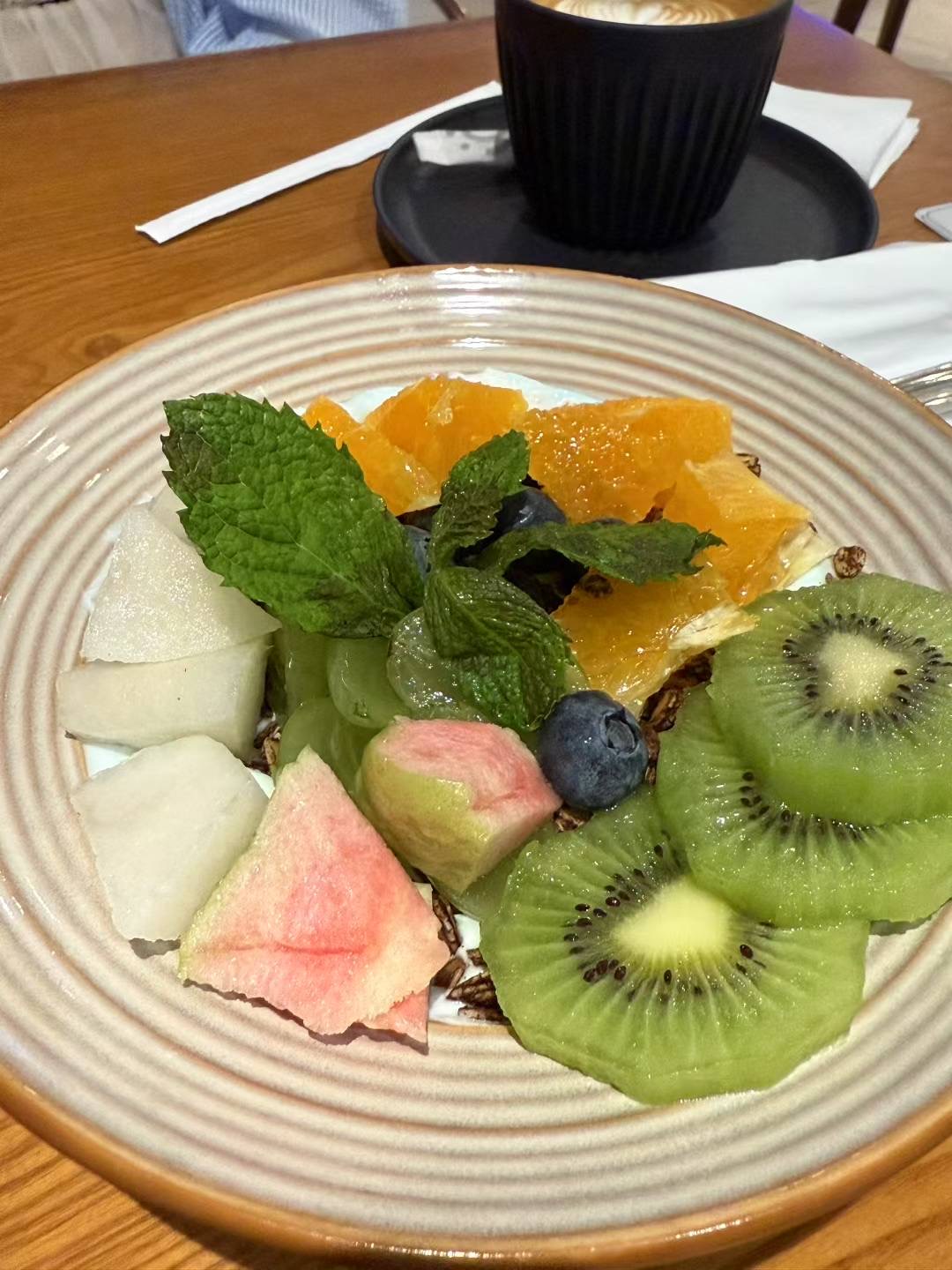 Fruit Salad | ["watermelon","kiwi","orange","melon","blueberry","mint"] | ["watermelon:100g","kiwi:100g","orange:100g","melon:100g","blueberry:50g"] | |