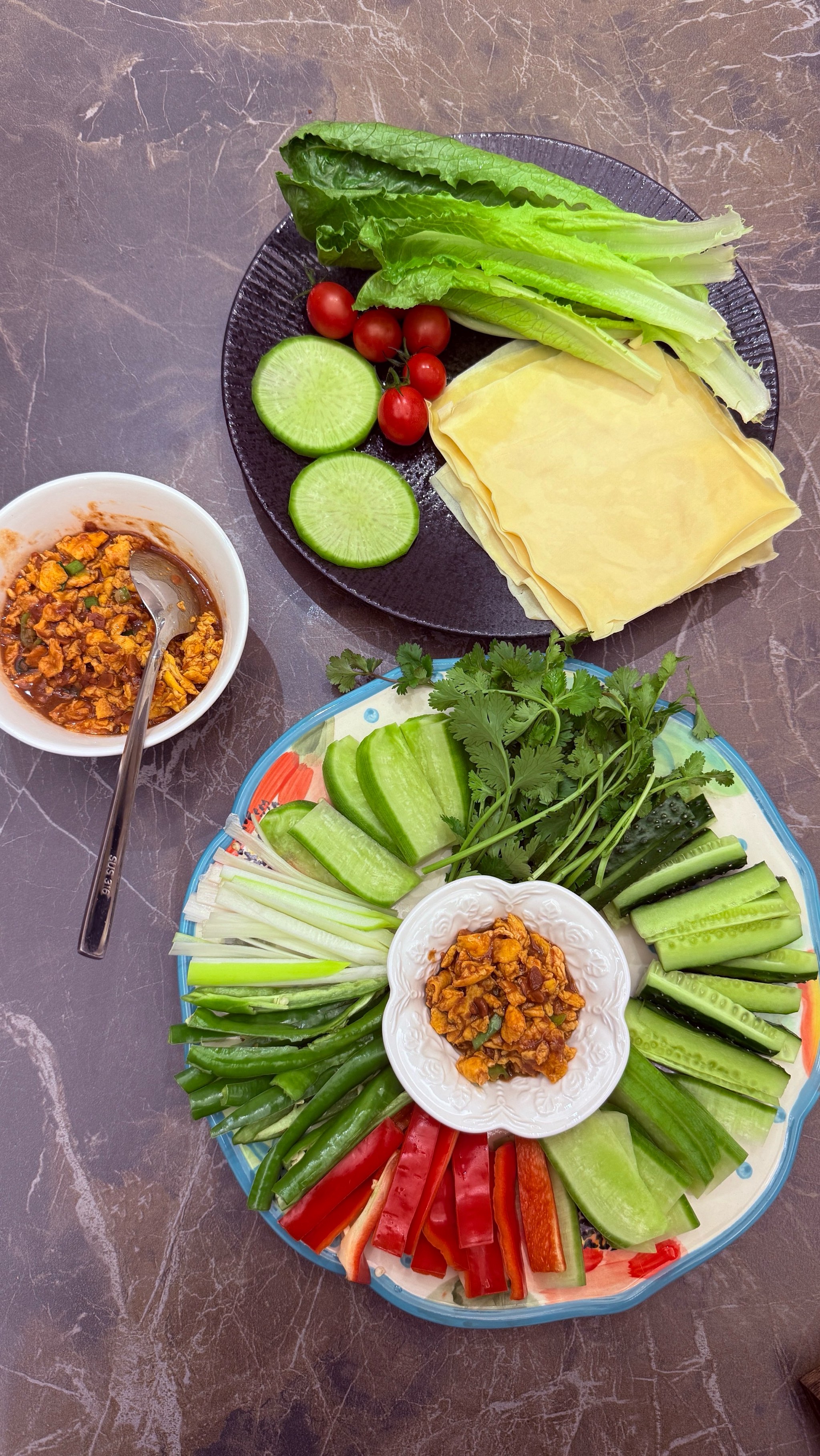 Vegetable Platter with Sauce | ["cucumbers","tomatoes","lettuce","sauce"] | ["cucumbers:200g","tomatoes:100g","lettuce:100g","sauce:50g"] | |
