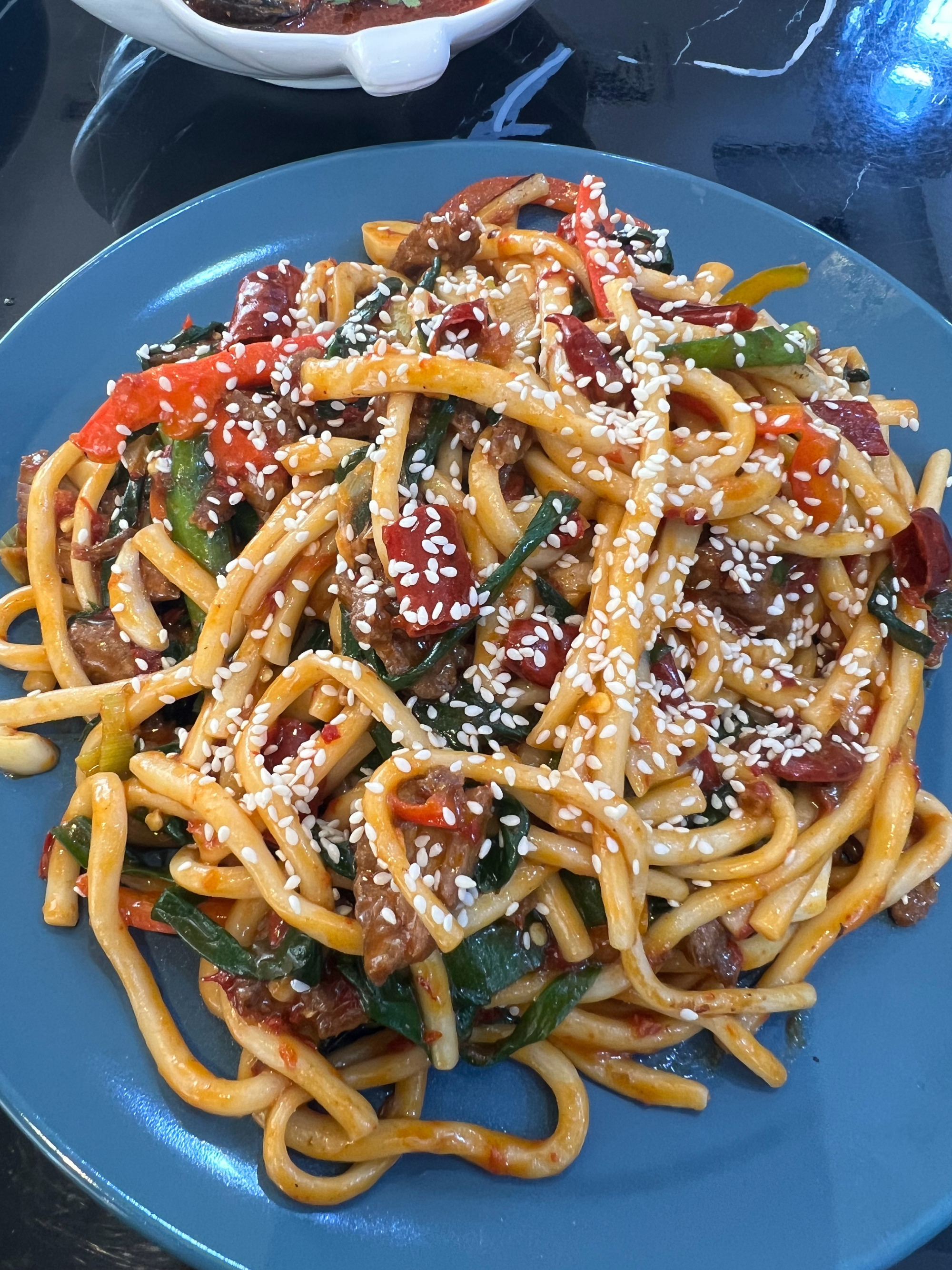 Stir-fried Noodles | ["noodles","beef","bell peppers","green onions","sesame seeds"] | ["noodles:300g","vegetables:100g","meat:100g"] | |