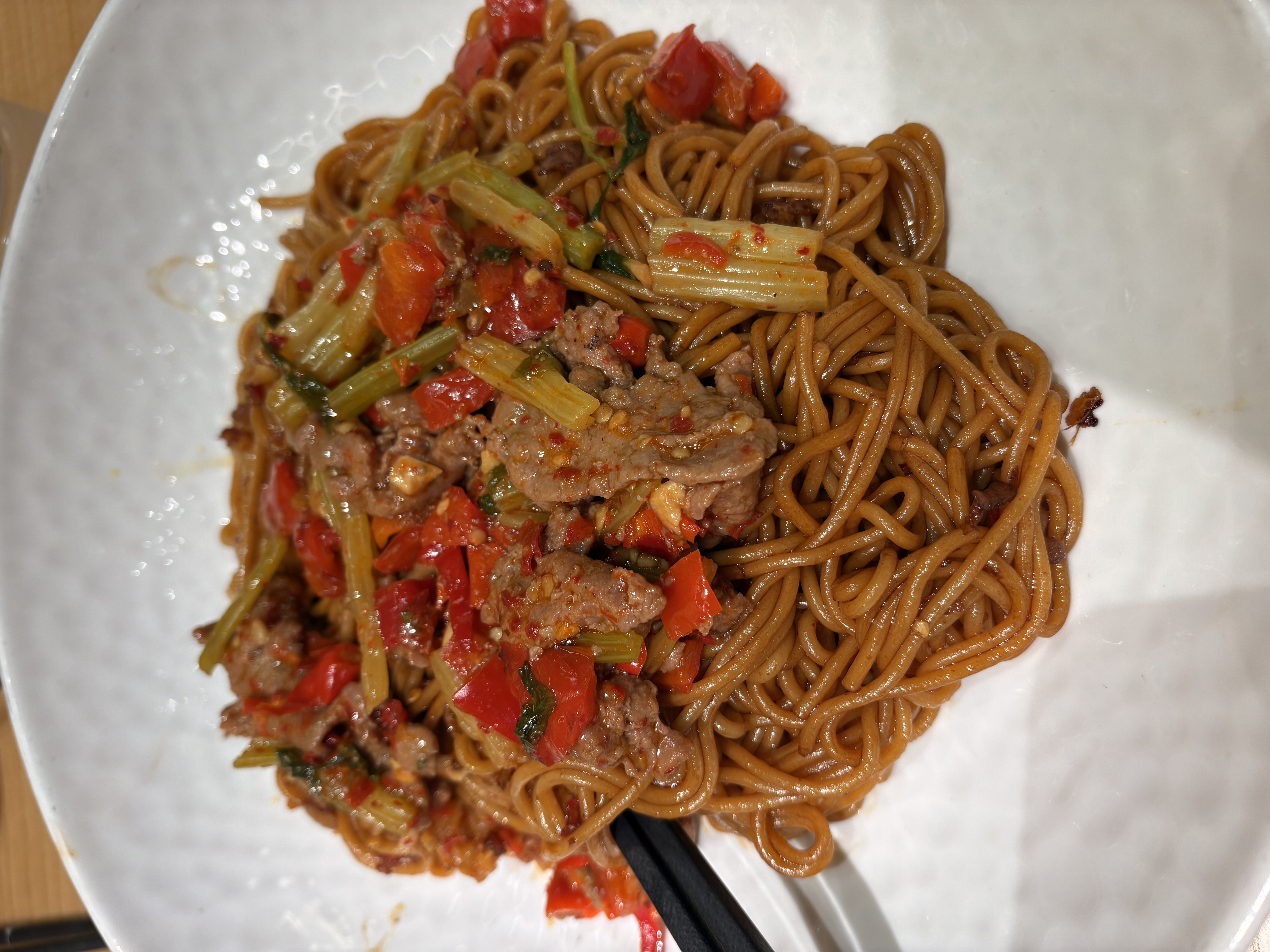 Stir-fried Noodles | ["noodles","ground meat","bell peppers","green onions","spices"] | ["noodles:300g","meat:100g","vegetables:50g"] | |