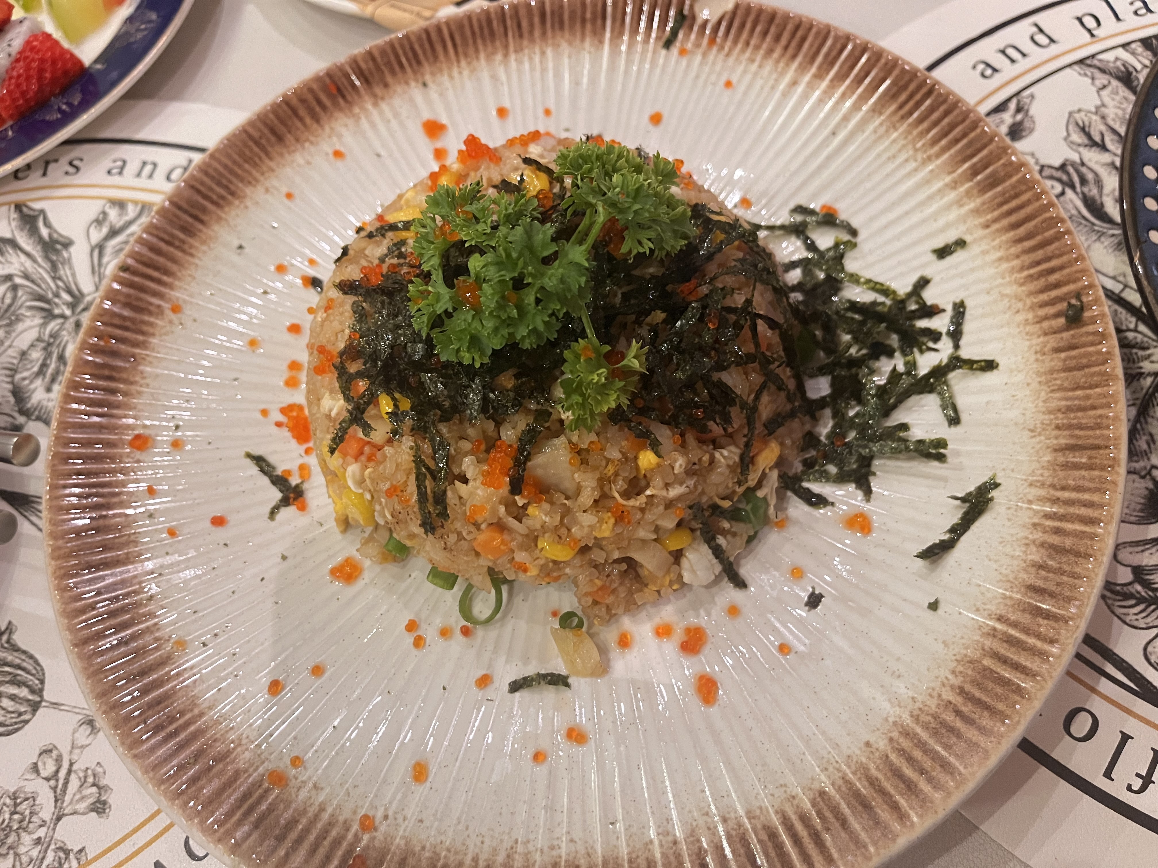 Fried Rice | ["rice","vegetables","seaweed","fish roe"] | ["rice:300g","vegetables:50g","seaweed:10g","fish roe:10g"] | |