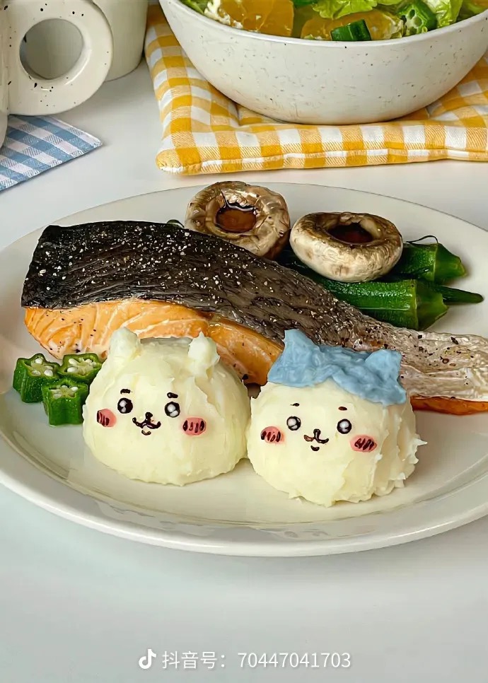 Salmon with Mashed Potatoes and Vegetables | ["salmon","mashed potatoes","okra","mushrooms"] | ["salmon:200g","mashed potatoes:150g","vegetables:100g"] | |