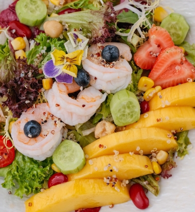 Shrimp Salad | ["shrimp","mango","lettuce","cucumber","strawberries","quinoa"] | ["shrimp:150g","mango:100g","lettuce:50g","other vegetables:100g"] | |