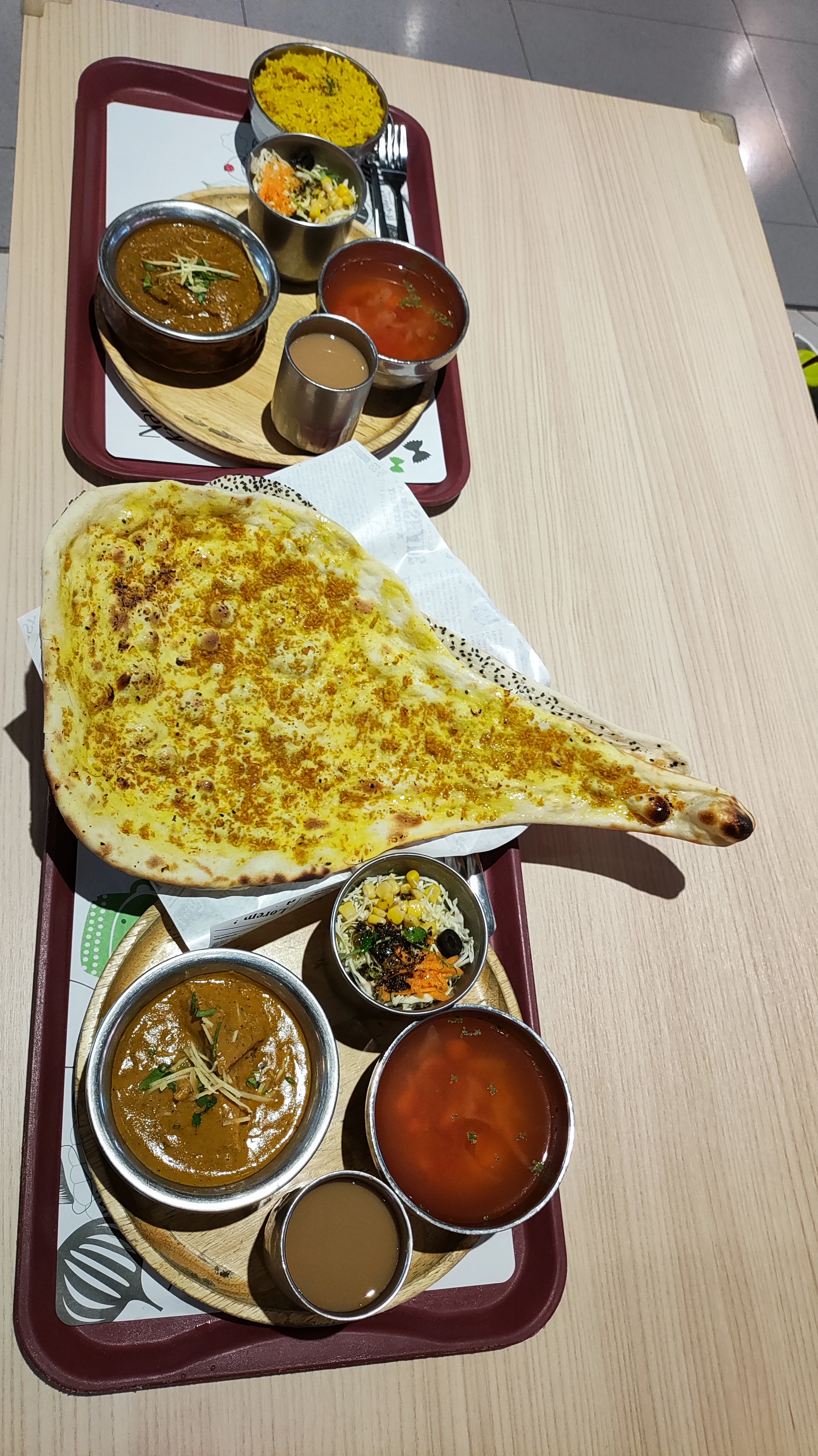Indian Thali | ["naan","chicken curry","dal","rice","vegetable salad","tea"] | ["naan:200g","curry:150g","rice:100g","soup:100g","tea:100g"] | |