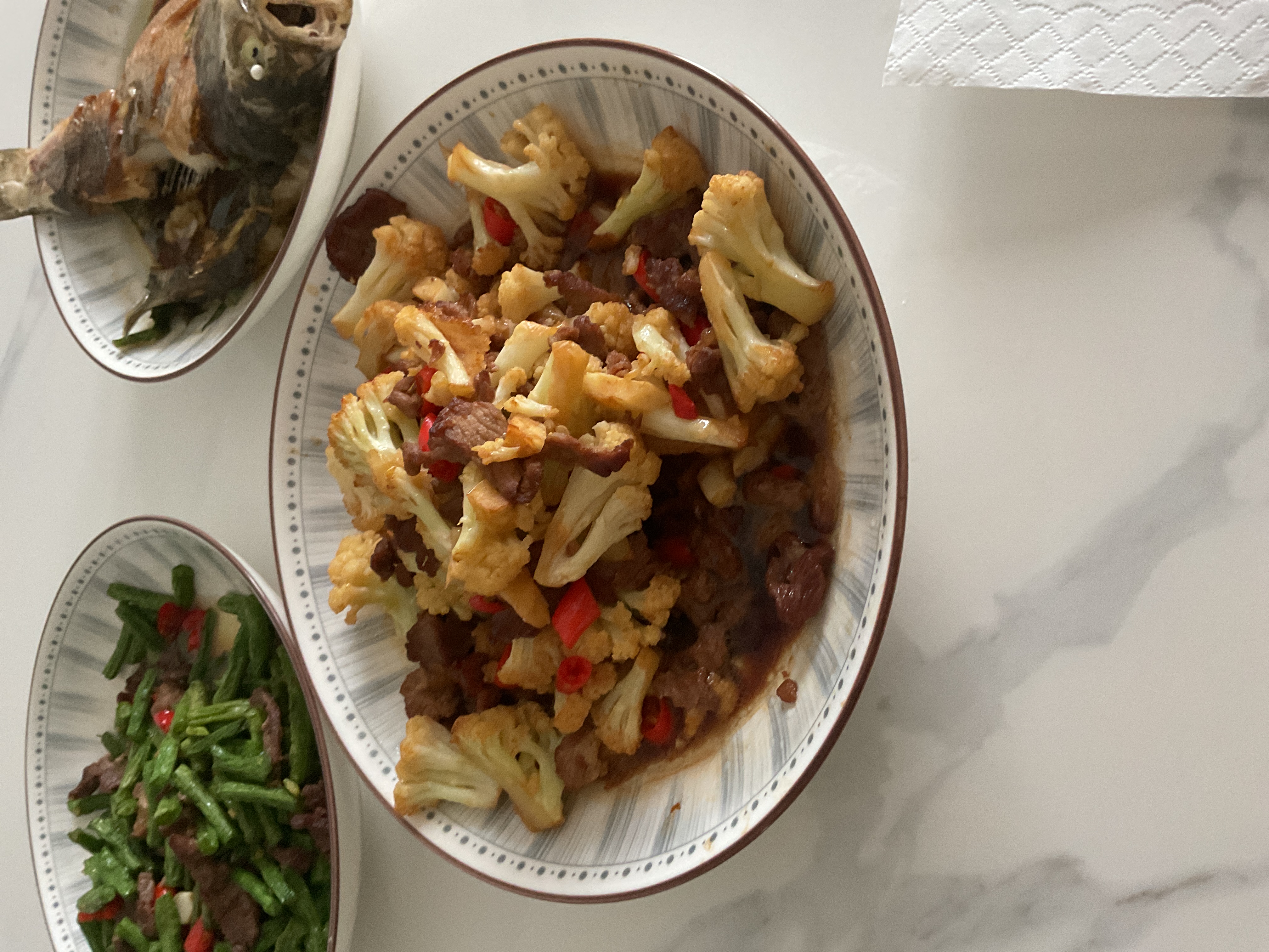 Stir-fried Cauliflower with Beef | ["cauliflower","beef","bell pepper","soy sauce","garlic"] | ["cauliflower:200g","beef:100g","bell pepper:50g"] | |