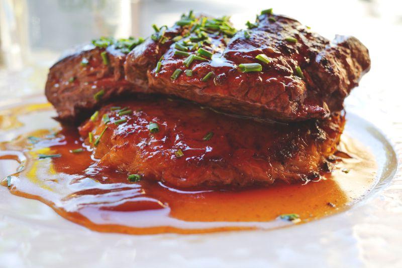 Steak with sauce | ["beef steak","sauce","chives"] | ["steak:250g","sauce:50g"] | |