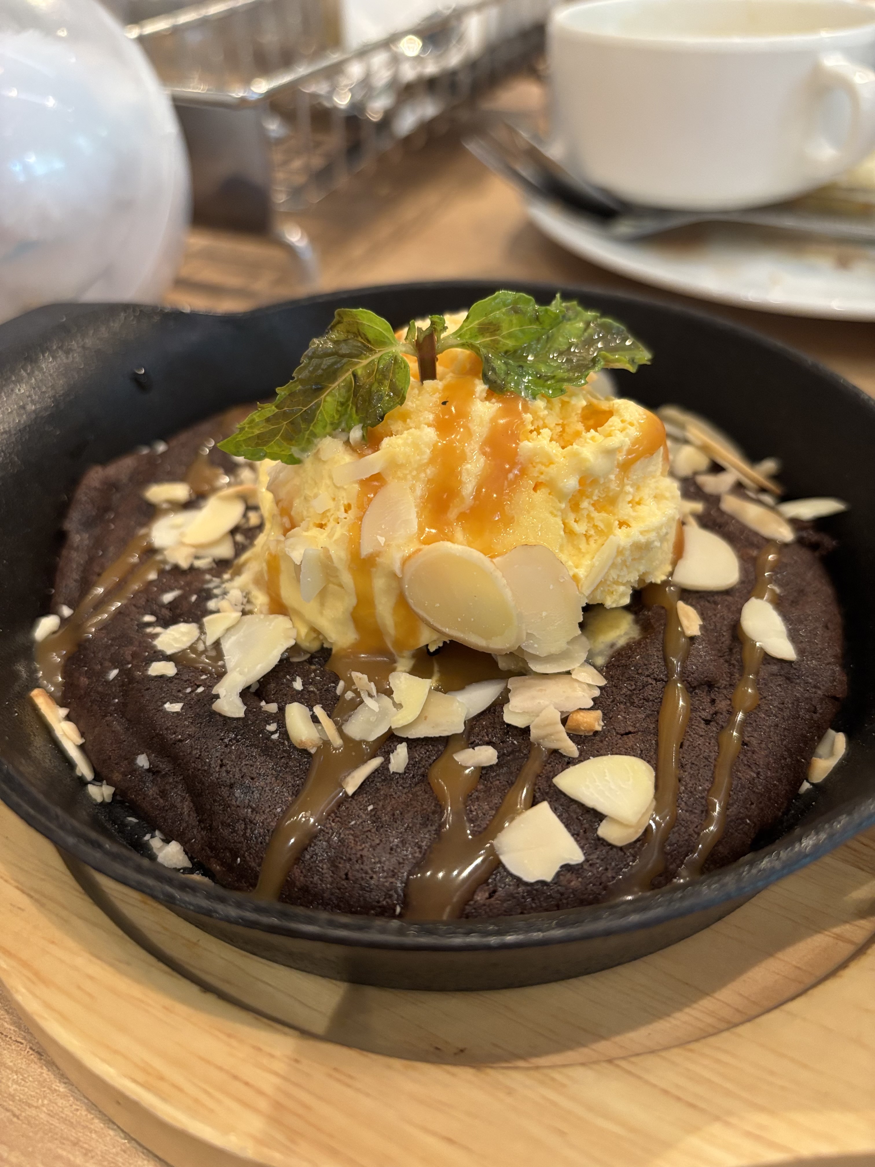 Chocolate Lava Cake with Ice Cream | ["chocolate cake","ice cream","caramel sauce","almonds","mint"] | ["cake:200g","ice cream:100g","syrup:30g"] | |