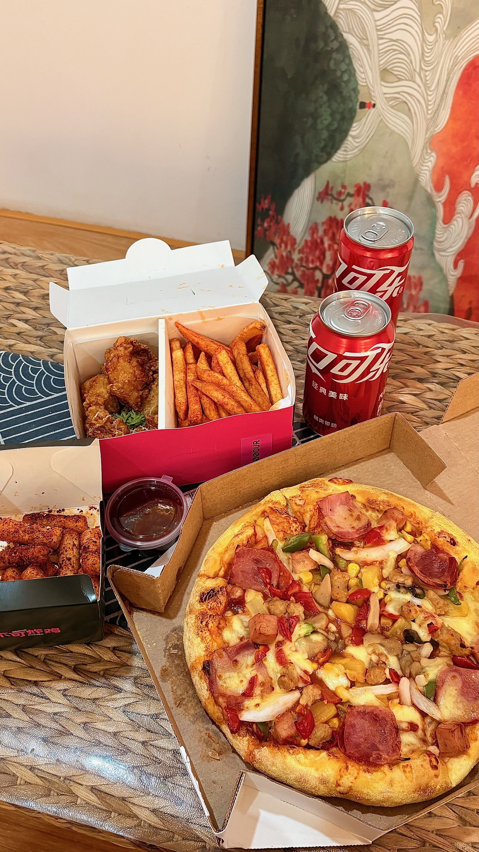 Mixed Fast Food Meal | ["pizza","fried chicken","sweet potato fries","soda"] | ["pizza:300g","fried chicken:200g","sweet potato fries:150g","soda:330ml"] | |