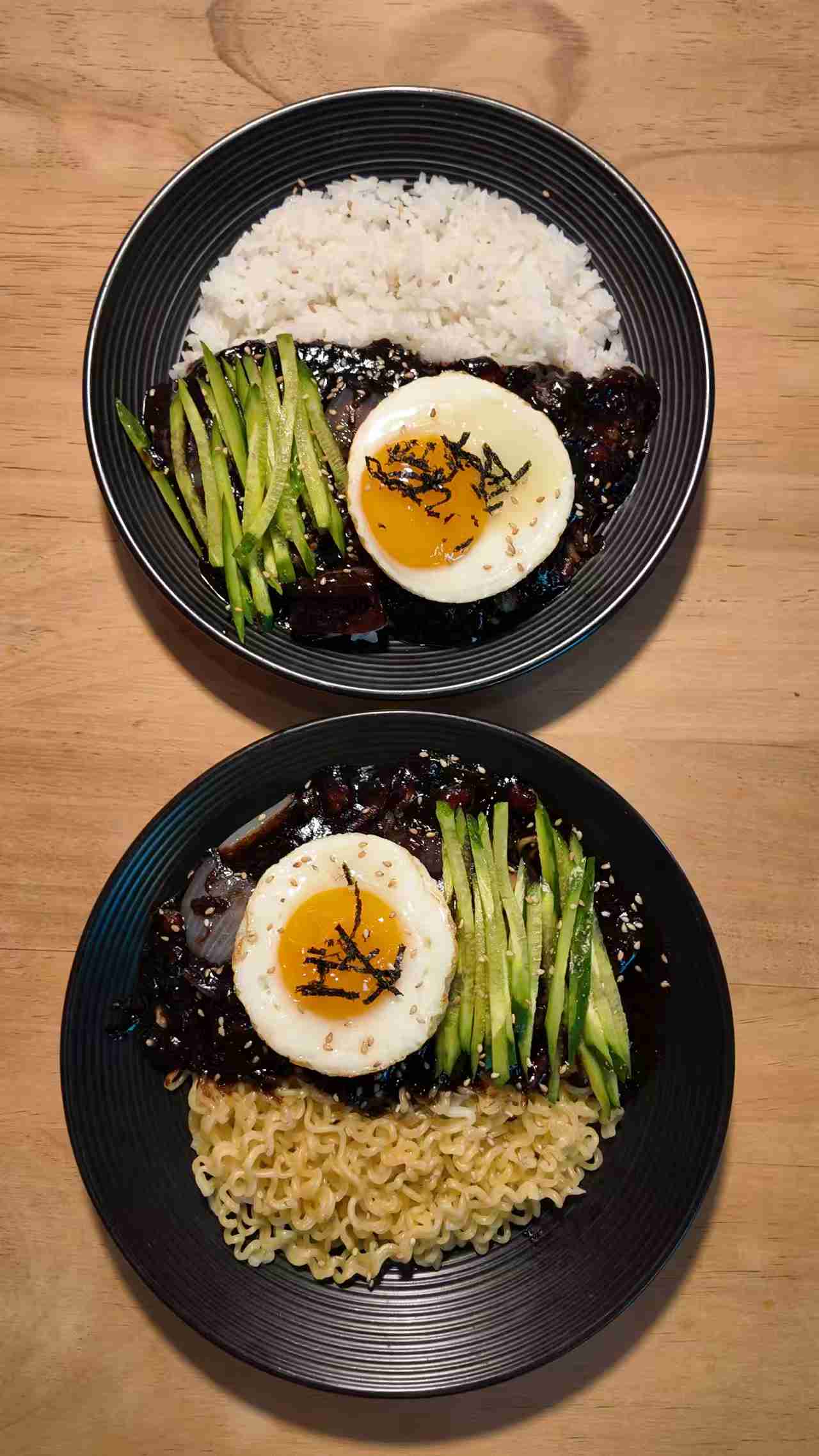 Bibimbap with Noodles | ["rice","noodles","egg","cucumber","seaweed","sesame seeds"] | ["rice:200g","noodles:150g","egg:100g","vegetables:100g"] | |