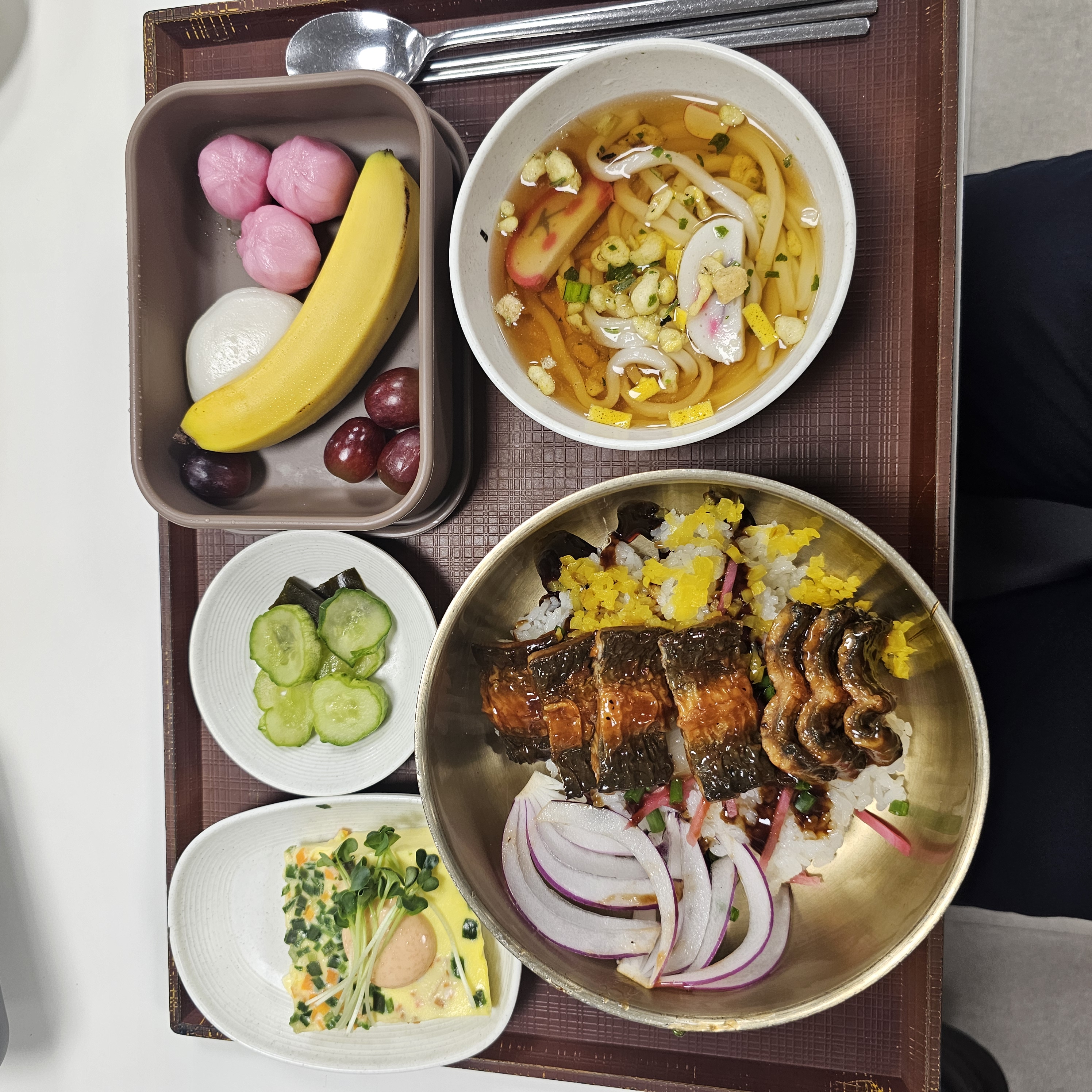 Mixed Asian Meal | ["rice","grilled fish","cucumbers","banana","grapes","noodles","vegetable broth"] | ["rice:200g","fish:150g","vegetables:100g","fruits:150g"] | |