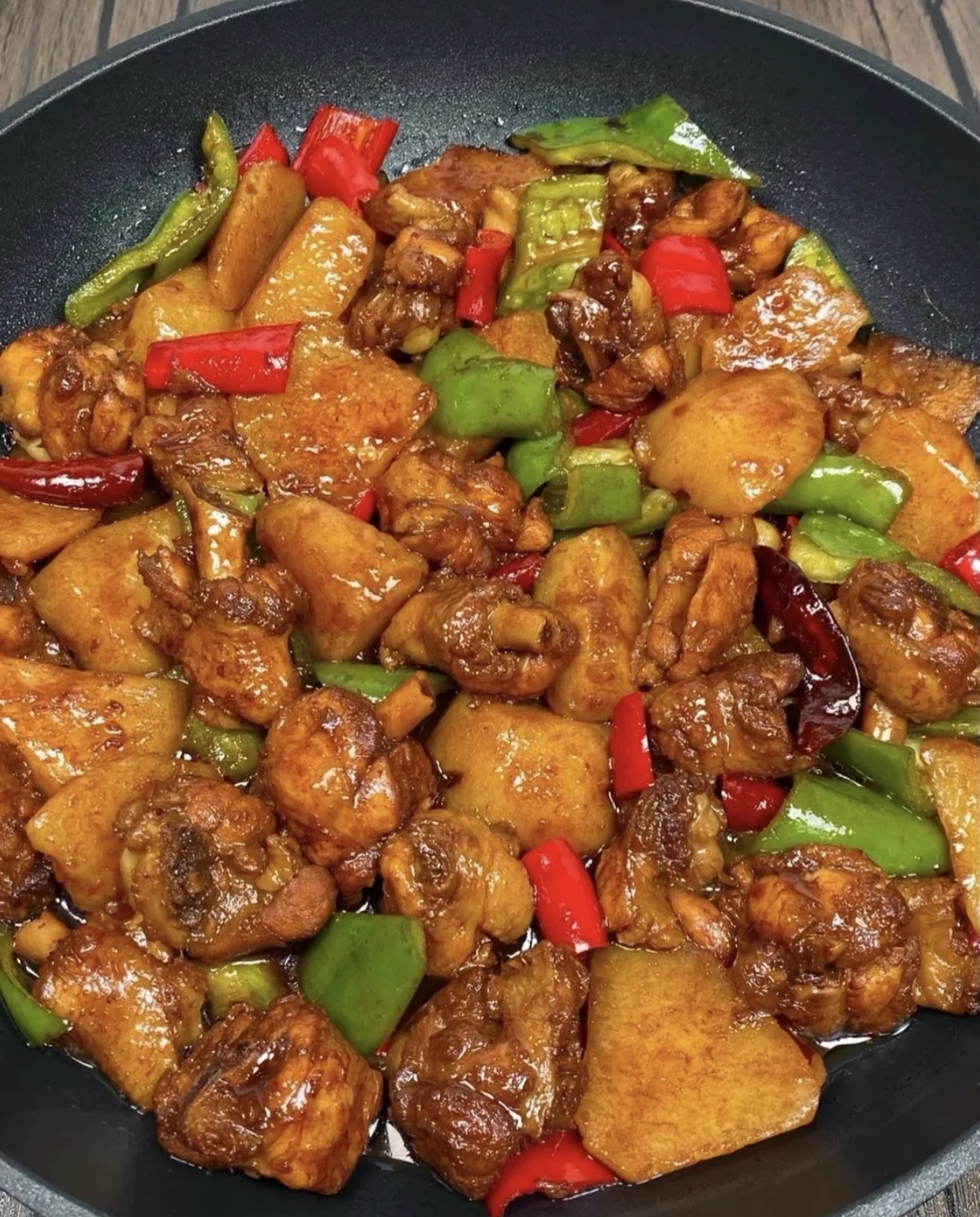 Chicken Stir-Fry | ["chicken","potatoes","bell peppers","soy sauce","spices"] | ["chicken:250g","potatoes:150g","bell peppers:100g"] | |