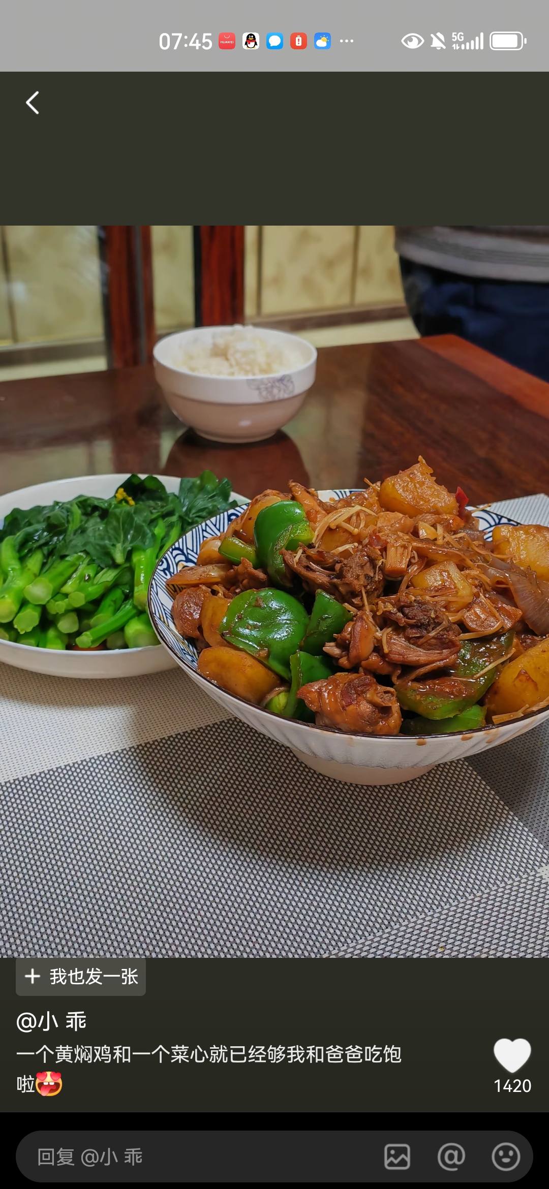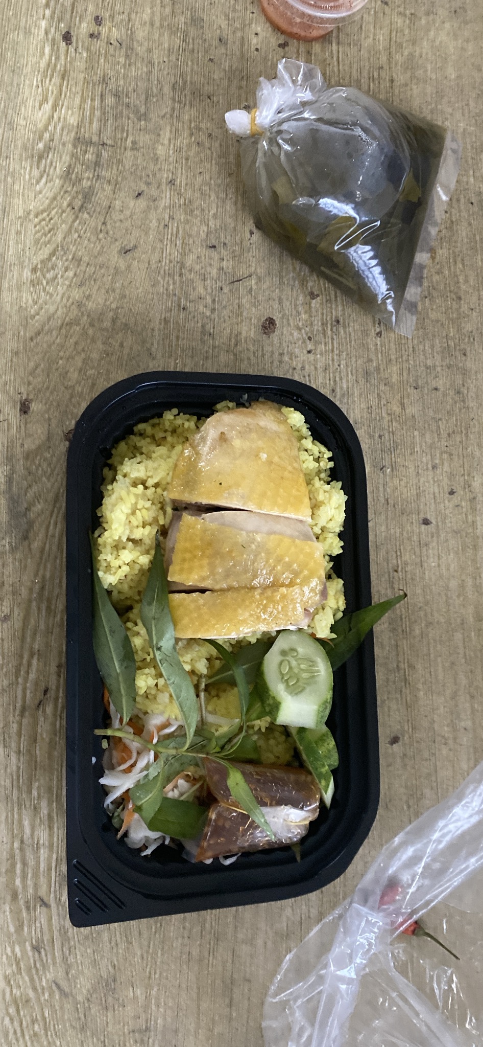 Chicken Rice | ["chicken","rice","cucumber","herbs","carrots"] | ["chicken:200g","rice:300g","vegetables:50g"] | |