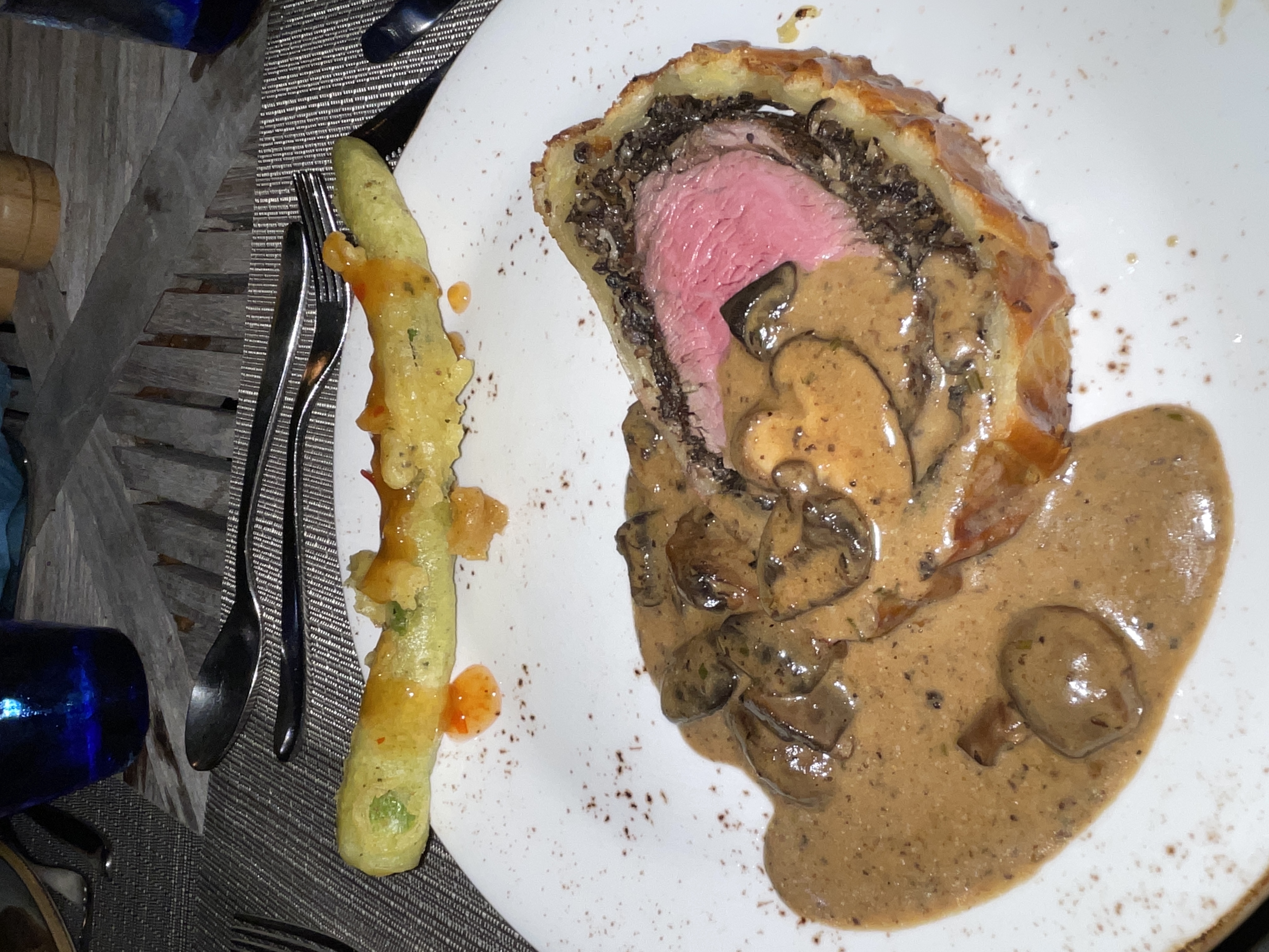 Beef Wellington | ["beef","mushrooms","puff pastry","cream","vegetables"] | ["beef:250g","sauce:100g","vegetable:50g"] | |