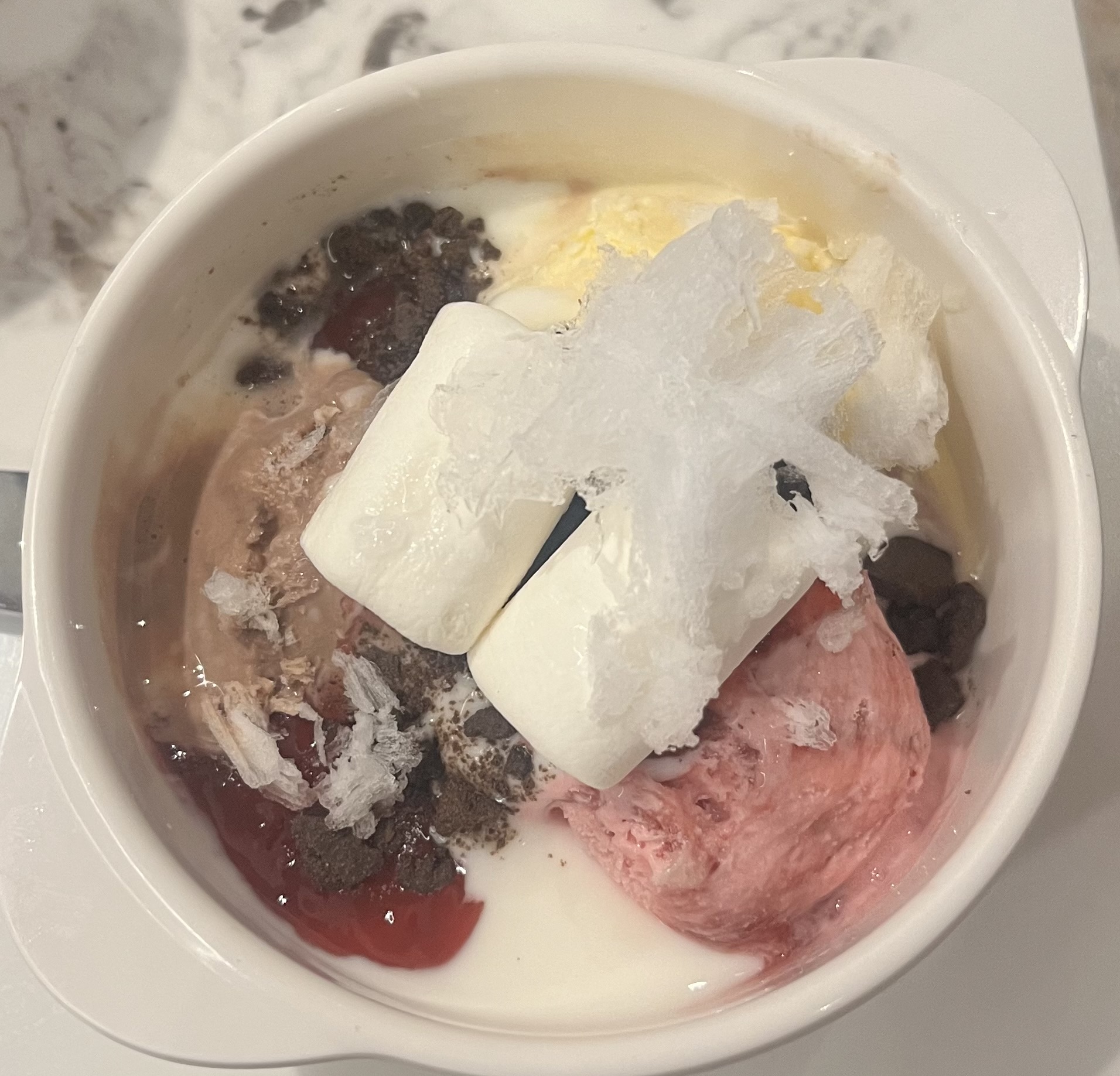 Ice Cream Sundae | ["ice cream","marshmallows","chocolate syrup","strawberry topping"] | ["ice cream:200g","marshmallows:30g","chocolate syrup:20g"] | |