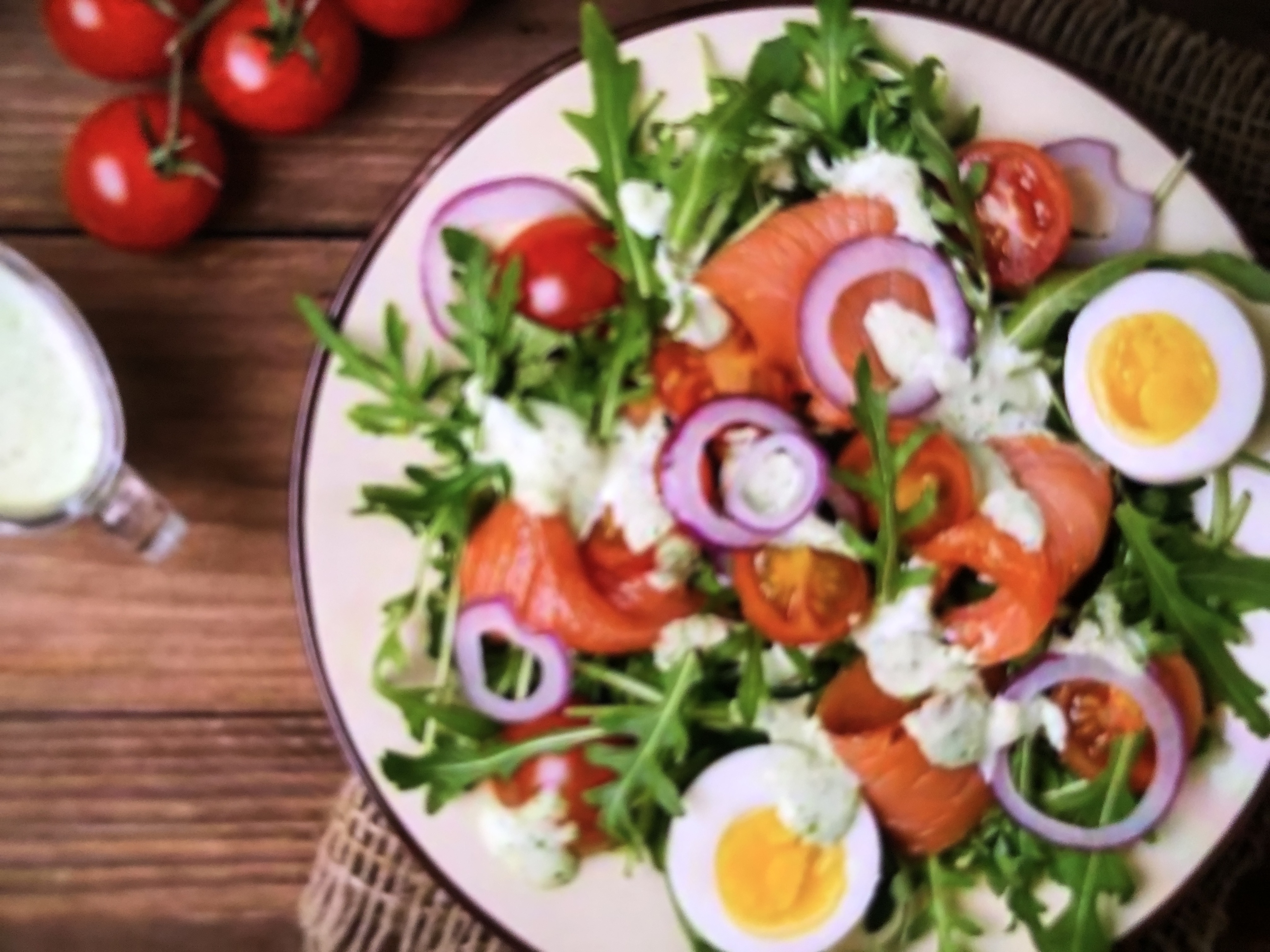 Salmon Salad | ["salmon","arugula","egg","tomato","onion"] | ["salmon:150g","arugula:100g","egg:100g","tomato:50g","onion:30g"] | |