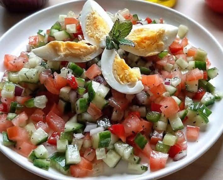 Vegetable Salad with Egg | ["cucumber","tomato","bell pepper","egg","onion","mint"] | ["cucumber:100g","tomato:100g","bell pepper:50g","egg:50g"] | |