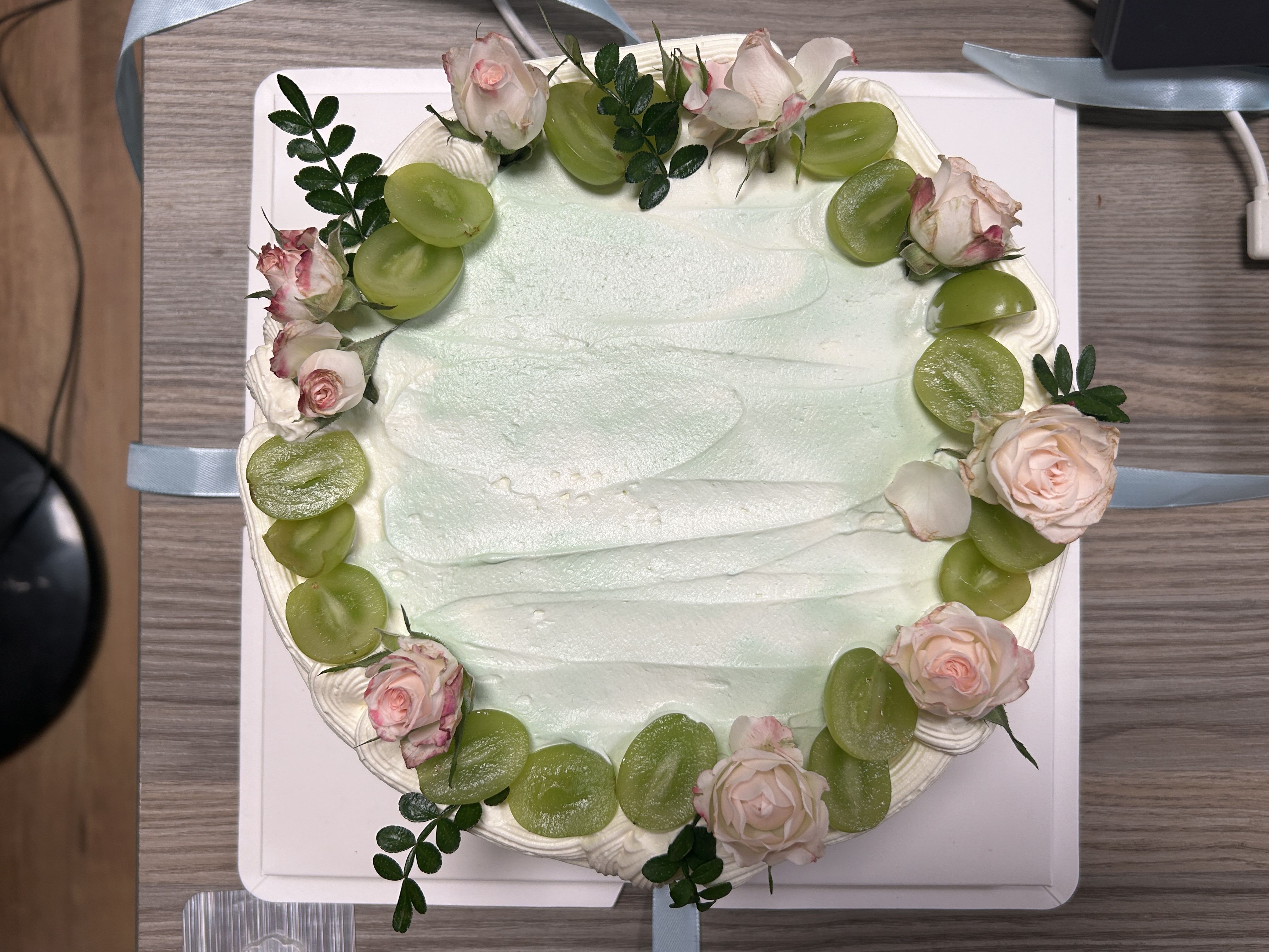 Fruit Cake | ["cake","grapes","cream","flowers"] | ["cake:300g","grapes:50g"] | |